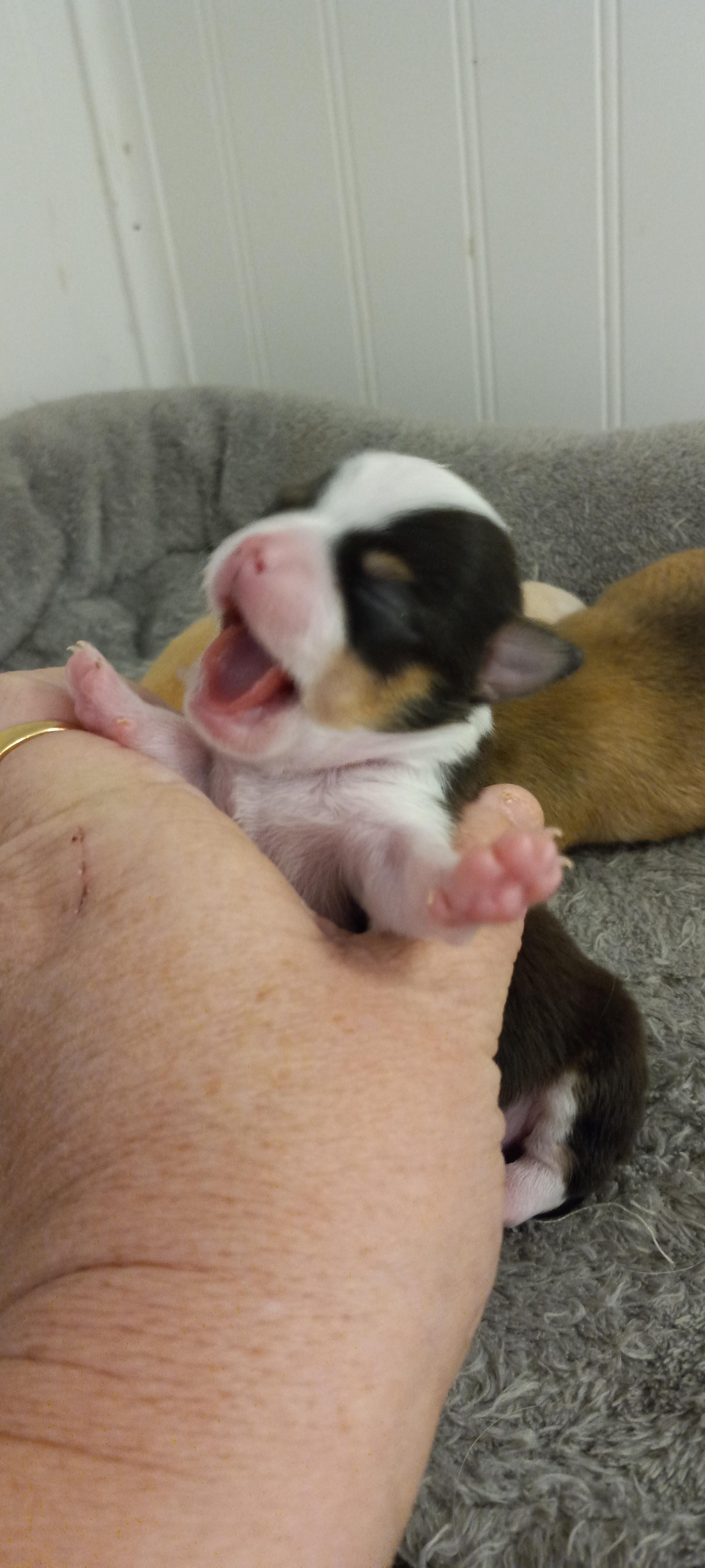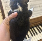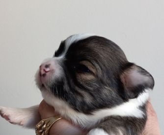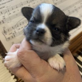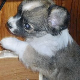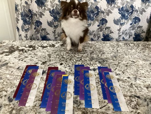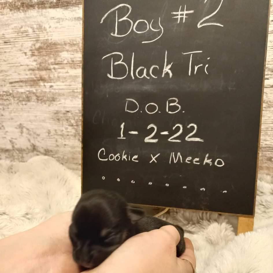 Meeko loves everyone and has a fun playful personality. He loves to snuggle and cuddle in the morning when I have my morning coffee. His coat is a silky dark chocolate tri color and his face shows so much expression. Meeko has earned his Champion title Ann is now working on his grand champion title!