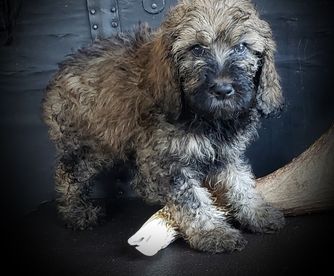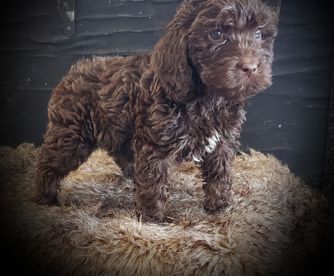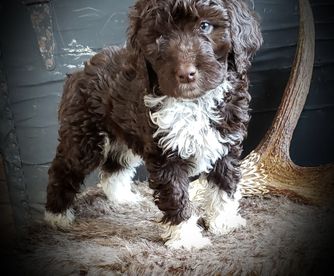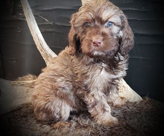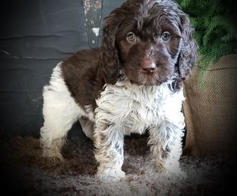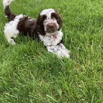 Ash is a beautiful girl. Shes a liver and white roan. Ash has the traditional markings, color, and build of our Euro Spaniels. Very sweet and loving like all our Springerdoodle and is a joy to be around.