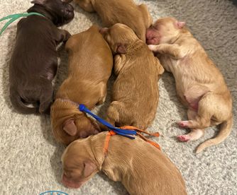 Our puppies include caramel cream, caramel, caramel red, red, apricot, cream, and chocolate. Colors will vary depending on the parent dogs.