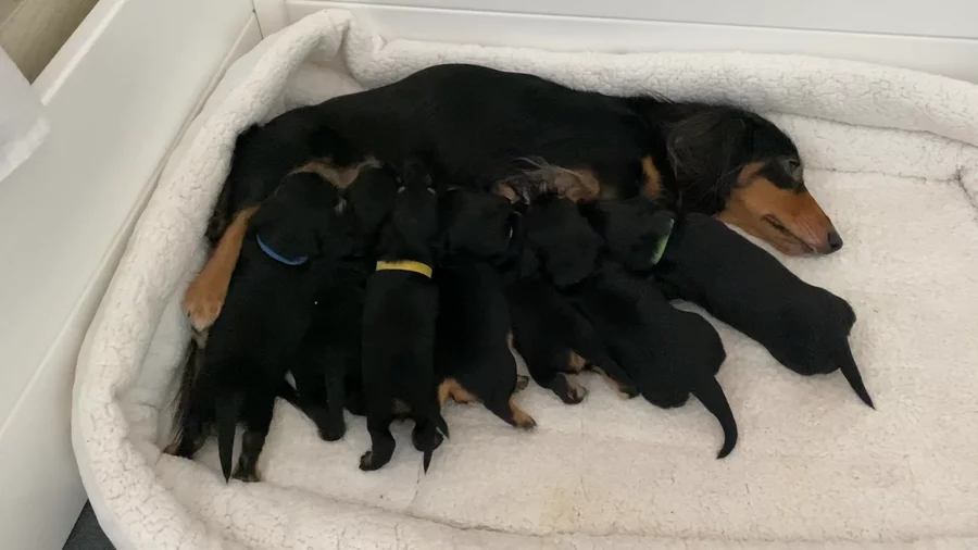 “Our puppies are AKC and both parents have had all genetic and OFA health testing and CHIC certification recommended by the AKC and The Dachshund Club of America. They will go home with a complete vet check, microchip, and all age appropriate dewormings and vaccinations, 30 days of free pet insurance as well as a bag of toys, treats, food and blanket with mom’s scent to ease transition.”