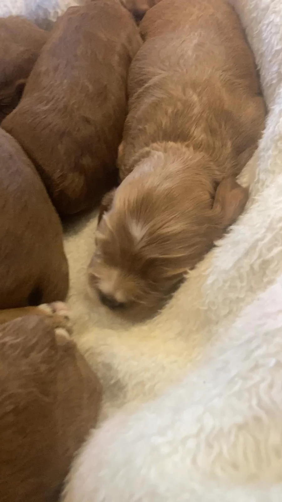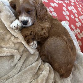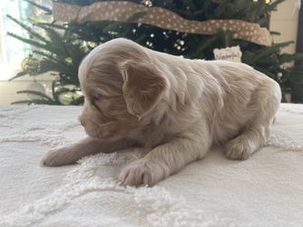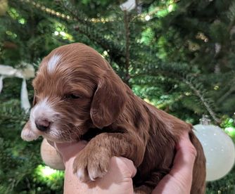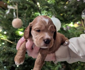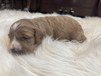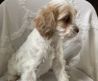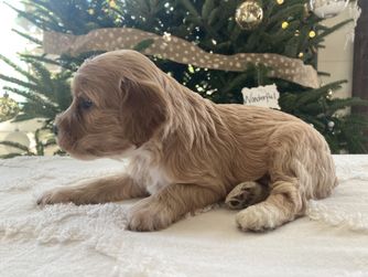 Our Cockapoo puppies include red and white, cream, and buff and white. Colors will vary depending on the parent dogs.
