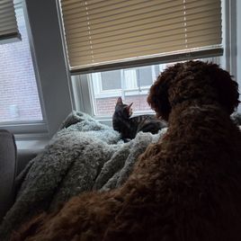 It's Charlie's first birthday today, so I thought I'd share an update! He is such a playful, happy boy. He is the perfect adventure buddy - loves hikes, swimming, and exploring new places. He is friendly with all dogs and is even brave about greeting the big dogs (Great Danes!) at the dog park. He gets along well with my kitten, although he sometimes gets jealous when all the attention isn't on him 🤣