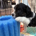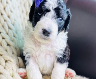 Our Bernedoodle puppies include chocolate merle, black and white, tri-color, phantom, and merle. Aussiedoodle puppies include brown and white, blue merle, black and white, and black tri-color. Colors will vary depending on the parent dogs.