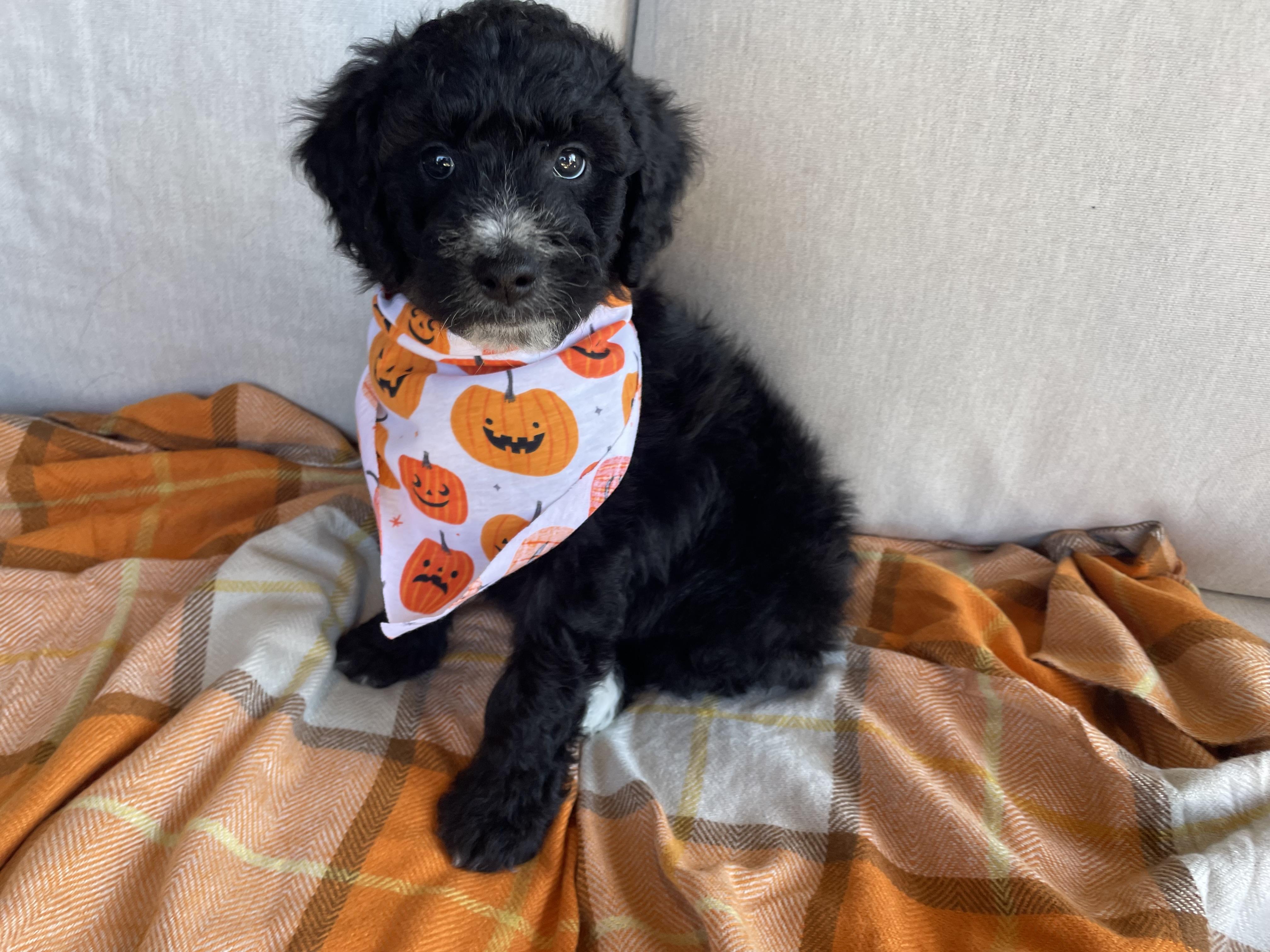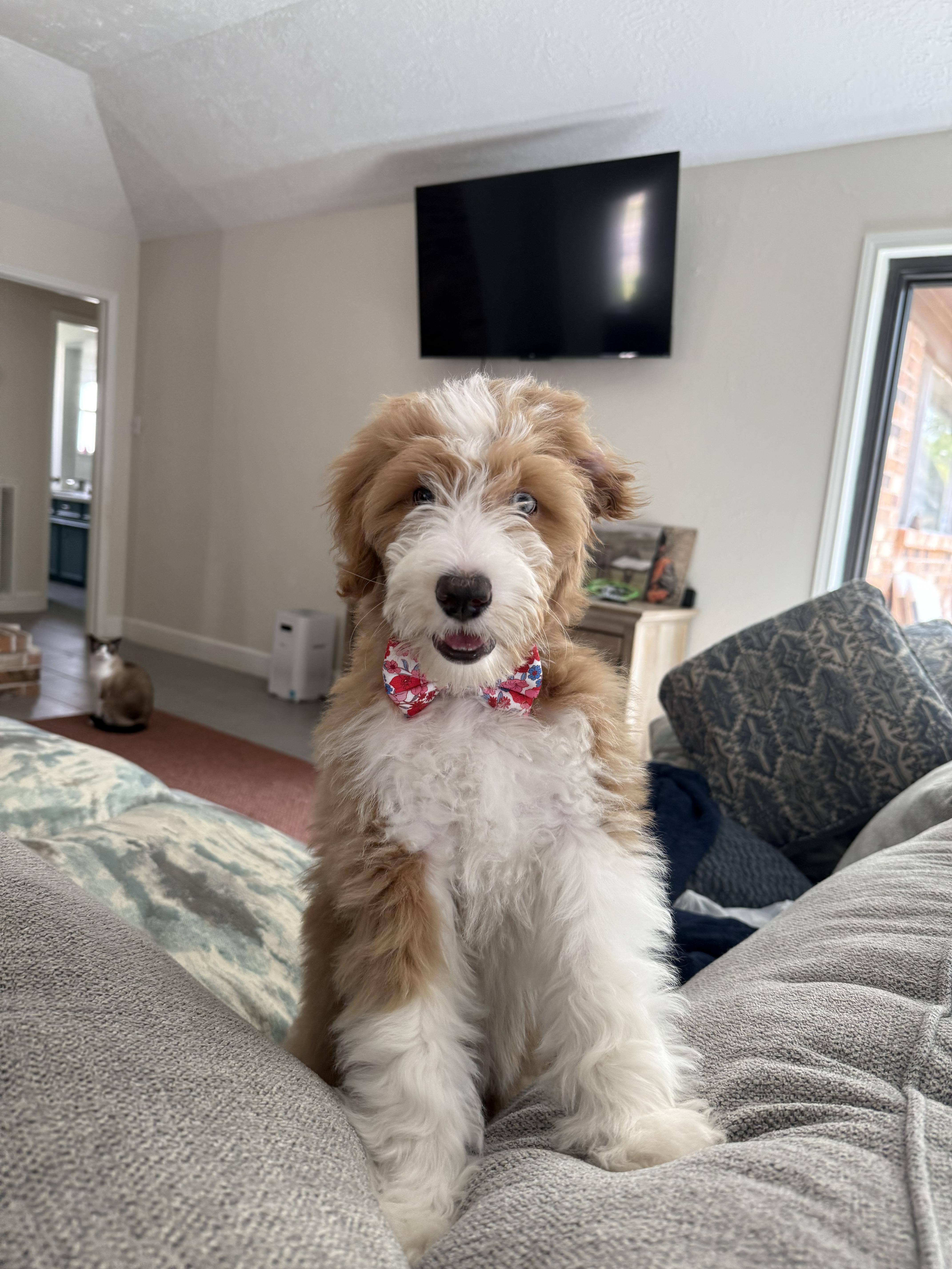 Our Aussiedoodle puppies are standard size. Bernedoodle puppies are mini size. Sizes will vary depending on the parent dogs.