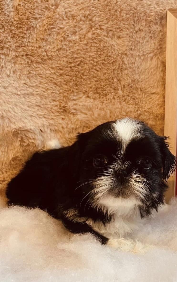 Our Shih Tzu puppies include black, black and white, and brindle. Colors will vary depending on the parent dogs.