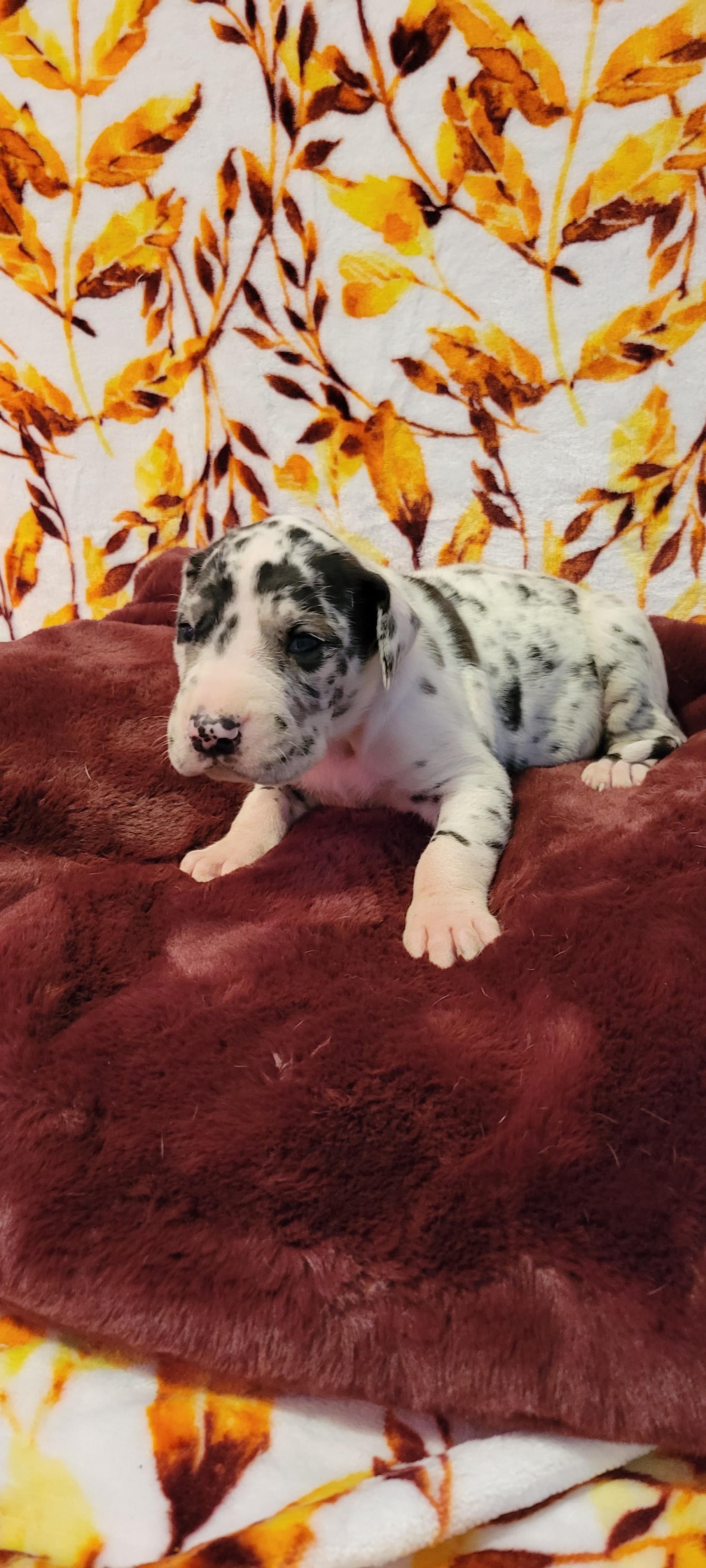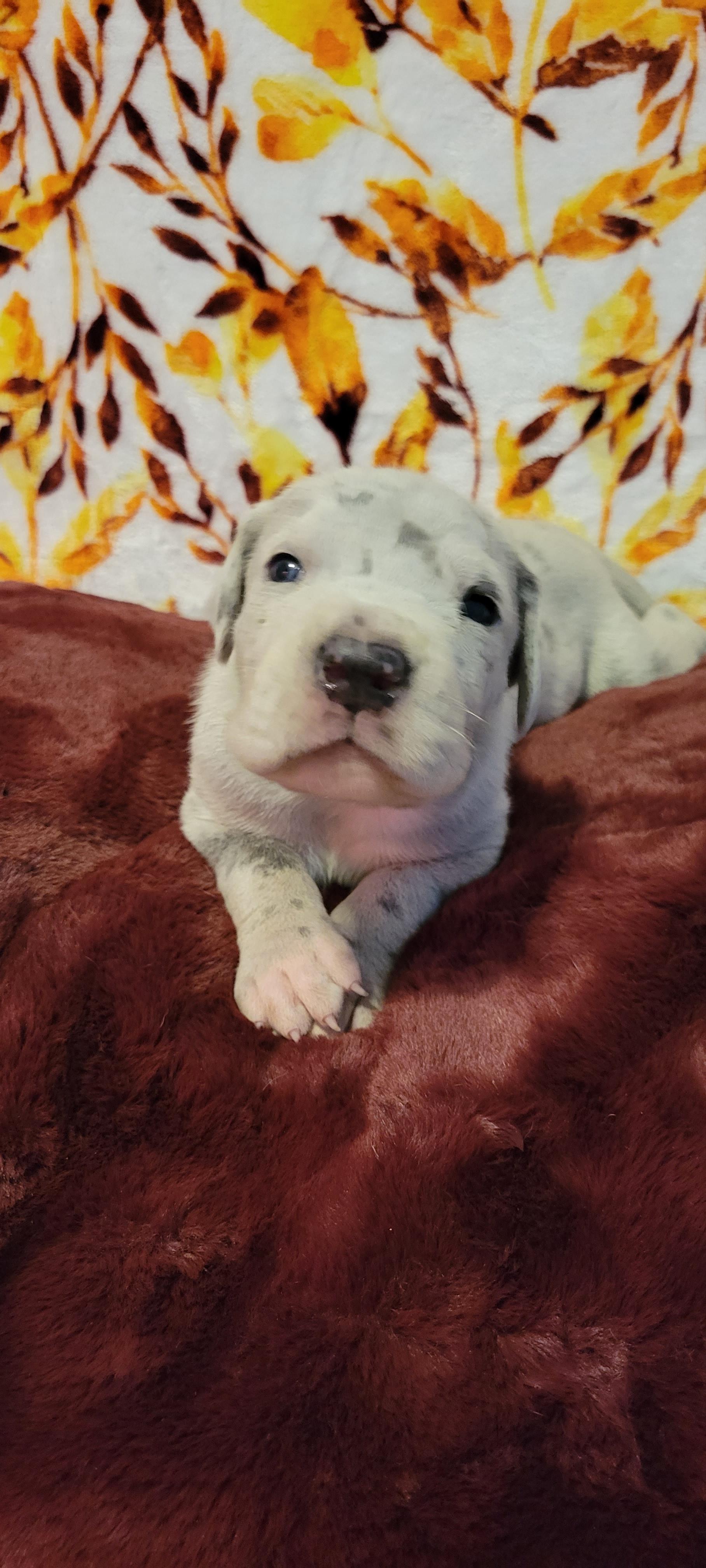 Our puppies include mantle merle, black and white, brindle, fawn, blue, harlequin, mantle, merle, and black. Colors will vary depending on the parent dogs.