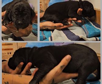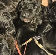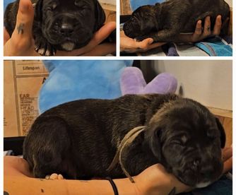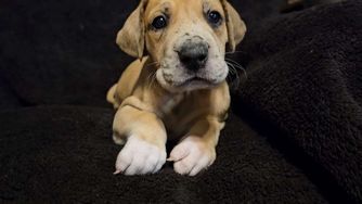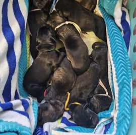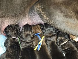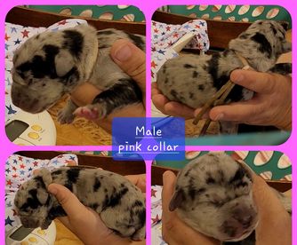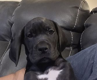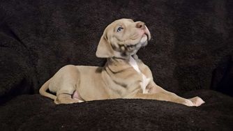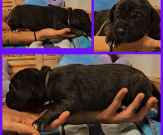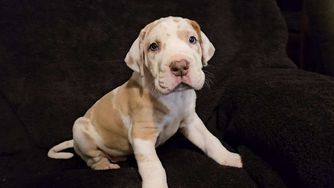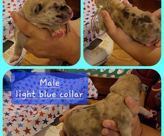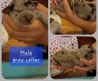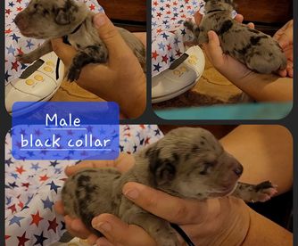 Our puppies include blue brindle, black and white, brindle, blue, and merle. Colors will vary depending on the parent dogs.