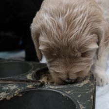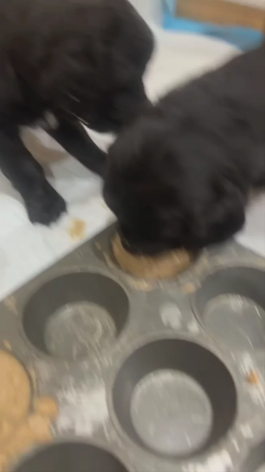 The puppies are now three and a half weeks old and they are eating puppy food *mush* for the first time