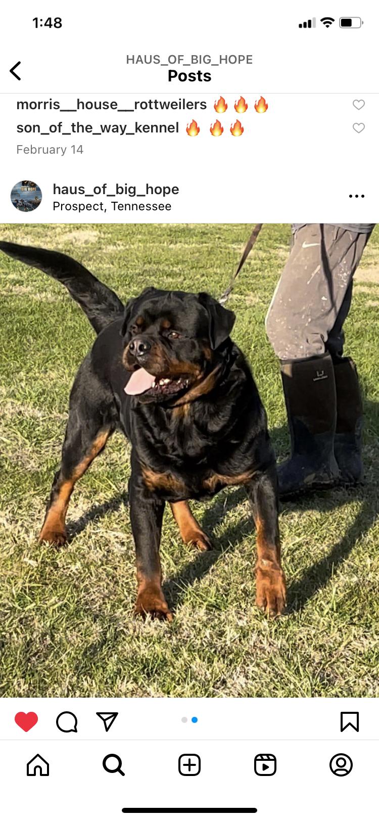 When I was 10 years old and one of my dogs got pregnant my mom did not really care for us so I spent most of my time in the backyard thank God it was summer hanging out with them I fell in love with the newborn puppies and watching them grow and starting to train them That I was so excited that I could not wait for the next batch to come but when I was 14 years old I started to do it myself I started to breed Pitbulls and I was very picky for a 14 year old let me tell you a Carrie Dontou About early 20s And then of course like everybody else my life kind of took a downside but when I was OK and back up again I bought my first Rottweiler!!! I owned a lot of different breeds but there was nothing better than this one I took so much time throughout the years learning about their bloodlines their personalities they’re good and bad traits just everything about them their structure is how they should be bred health concerns and here I am with my now beautiful program which I am not done adding to I plan to get better here on out