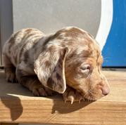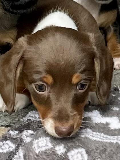This is a male chocolate and cream short hair miniature dachshund. He’s available for pick up the first week of January.