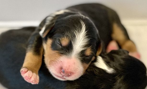 Our Bernedoodle puppies include brown, sable, black and white, tri-color, and phantom. Bernese Mountain Dog puppies are black rust and white. Colors will vary depending on the parent dogs.