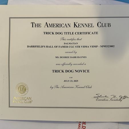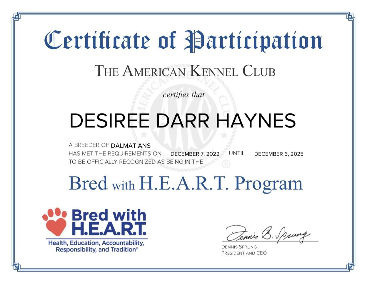 Darrfield reports to performing the health tests below on their breeding dogs. Ask your breeder about the tests performed on the parents of your litter. Learn more about health testing for Dalmatians.