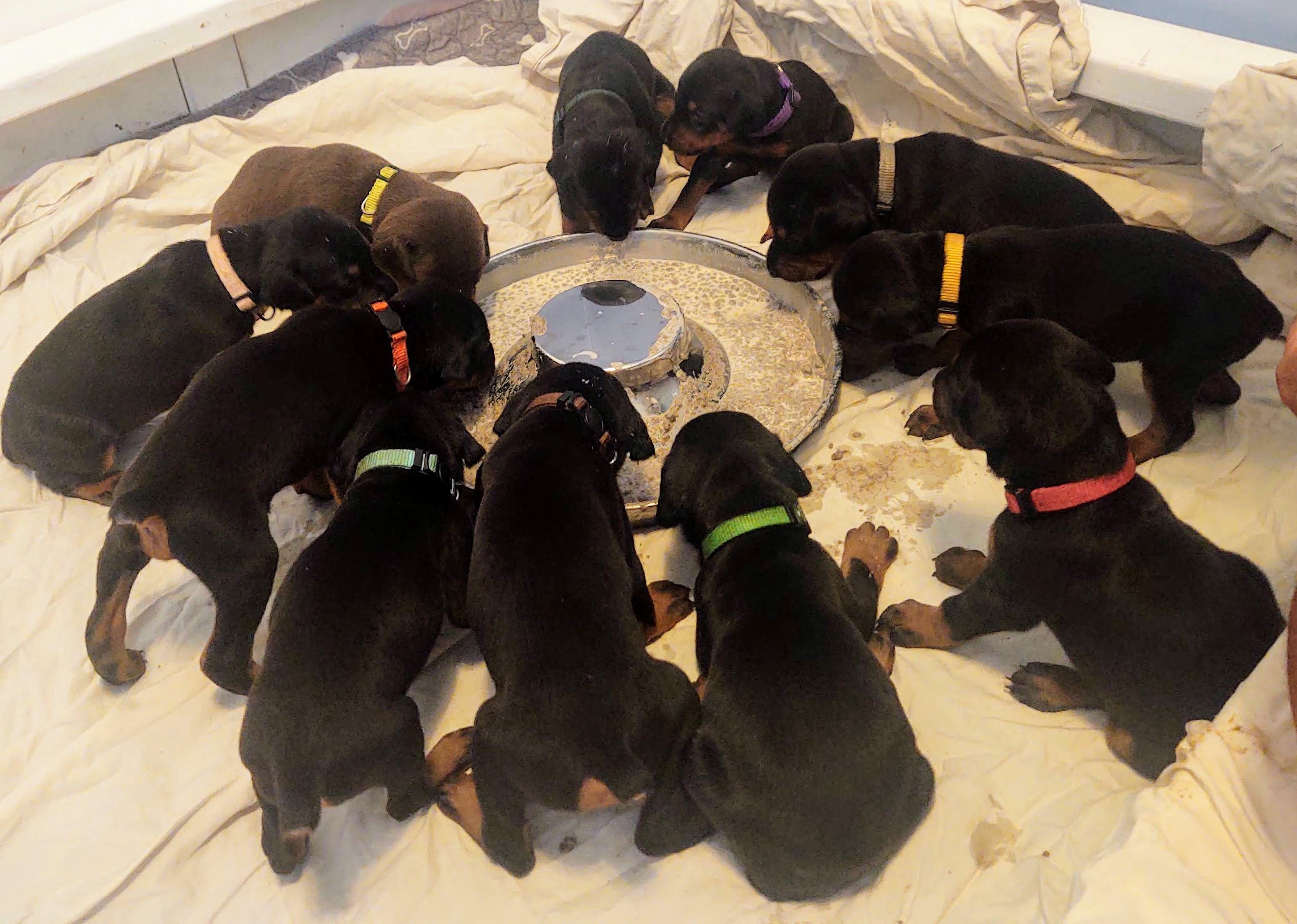 Our puppies include black and rust, blue and rust, fawn (isabella) and rust, and red and rust. Colors will vary depending on the parent dogs.