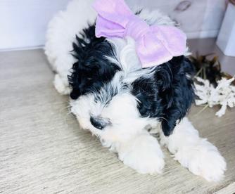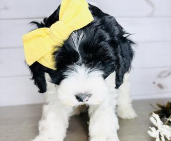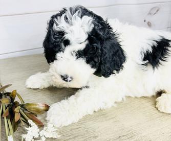 Our Sheepadoodle puppies include gray and white, brown and white, blue merle and white, and black and white. Cavapoo puppies include merle, tri-color, red, and apricot. Colors will vary depending on the parent dogs.