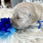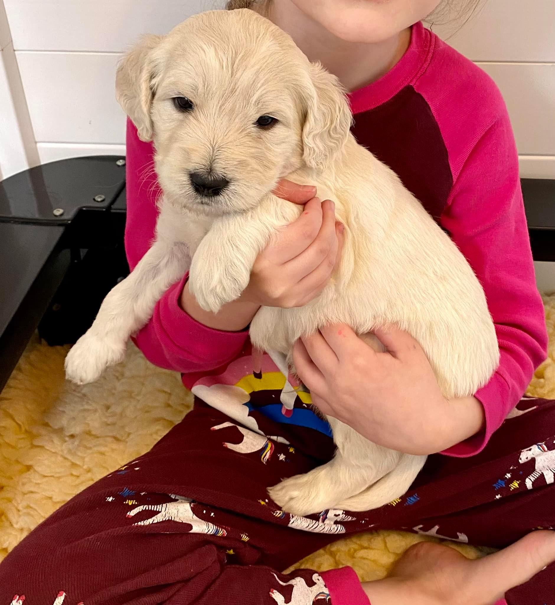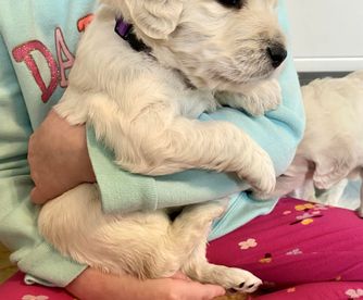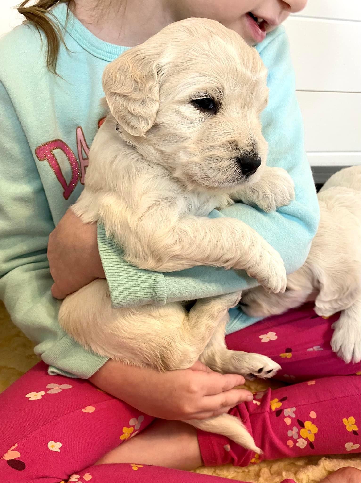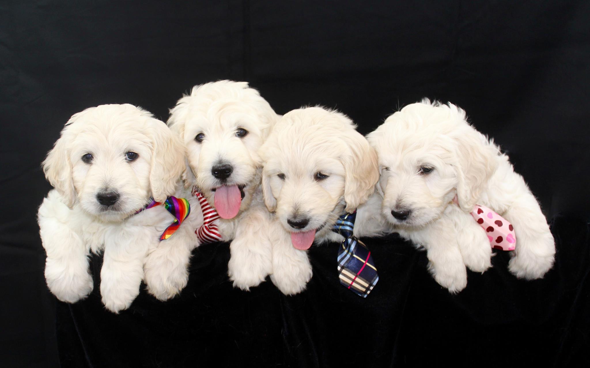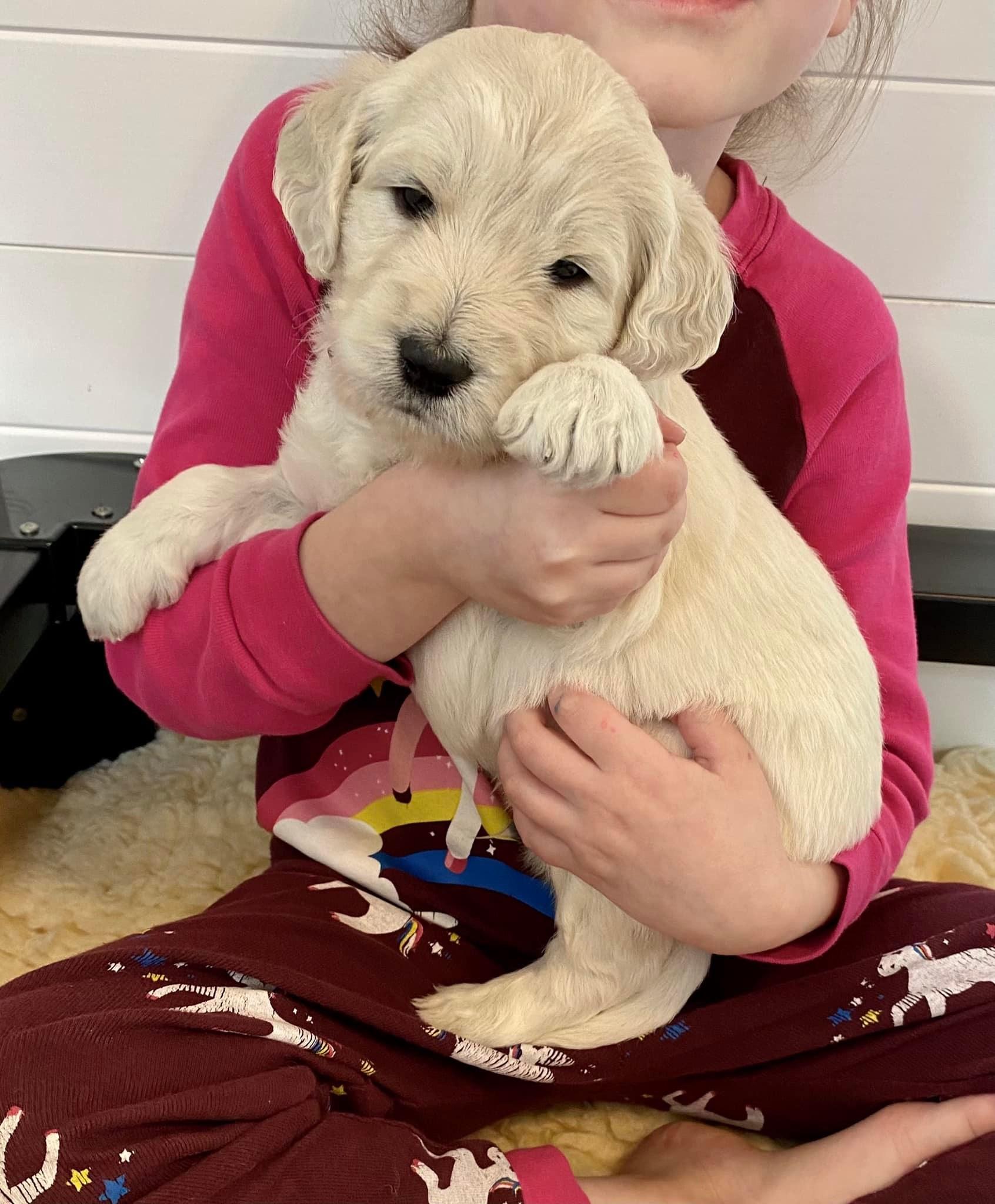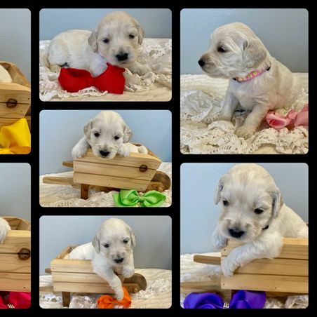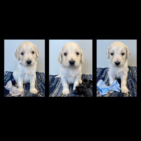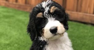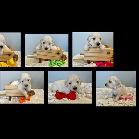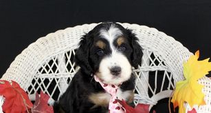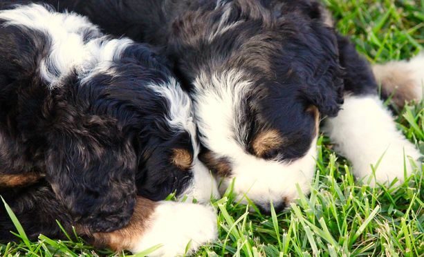 Our Bernedoodle puppies include tri-color and merle. Goldendoodle puppies are cream. Colors will vary depending on the parent dogs.