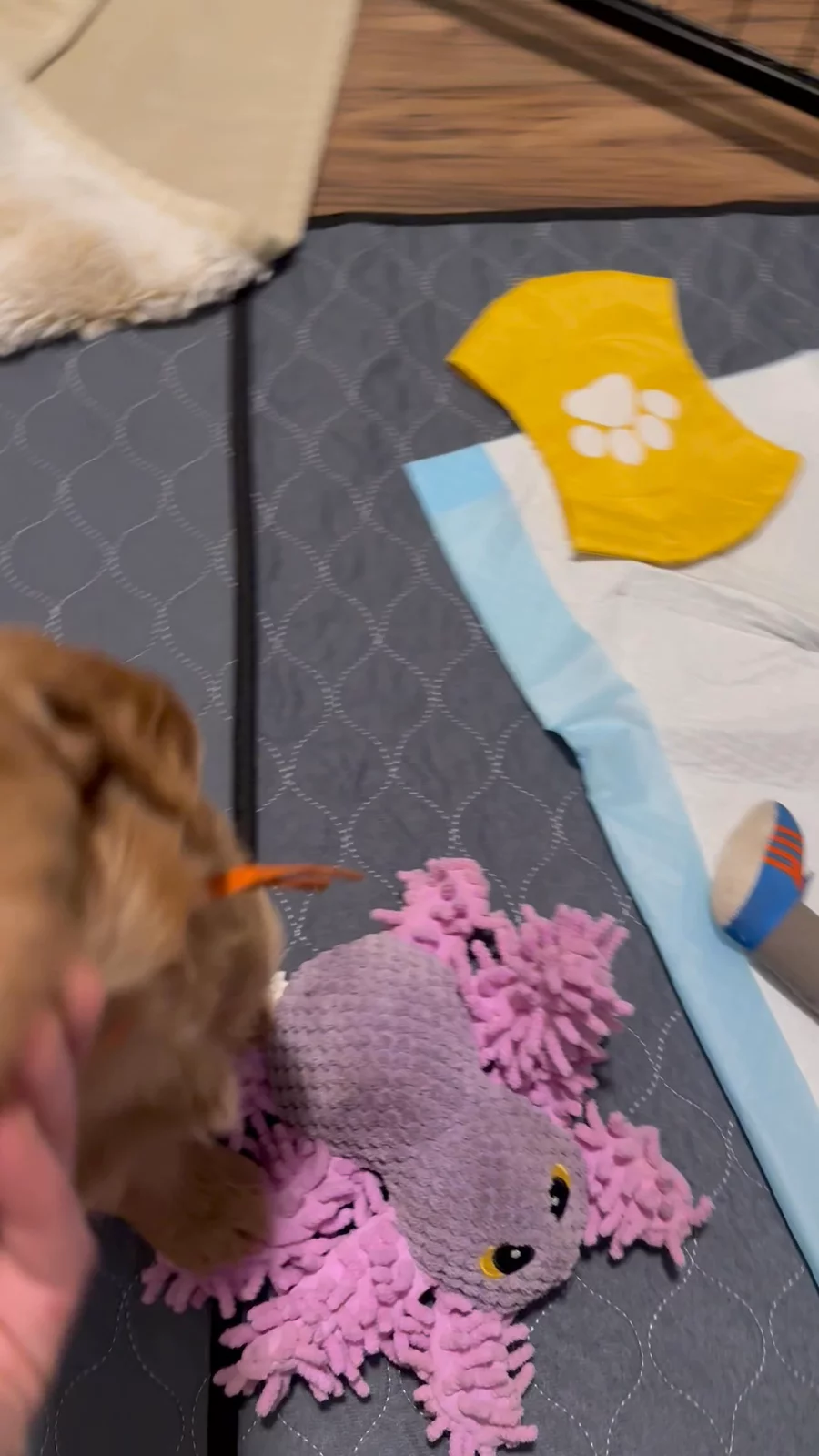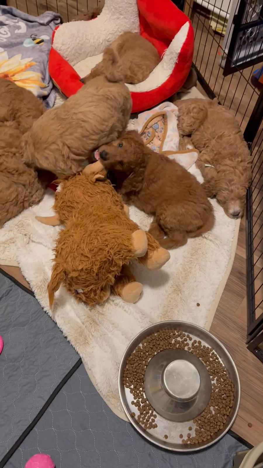 Puppies are thoroughly enjoying their play area and are making significant progress in learning to use pee pads and pee crates. It’s been almost 5 weeks now. Their personalities are beginning to emerge, and each one is incredibly affectionate. Their vet appointment is approaching, during which they will undergo a comprehensive health examination and receive their first round of vaccinations. Despite their newfound independence, they still spend most of their time sleeping. When they are awake, they explore and play with their toys and enrichment puzzles. Mama is gradually weaning off a bit as they are getting used to puppy mush, which they relish. They are also sleeping without Mama and adapting well to this transition.