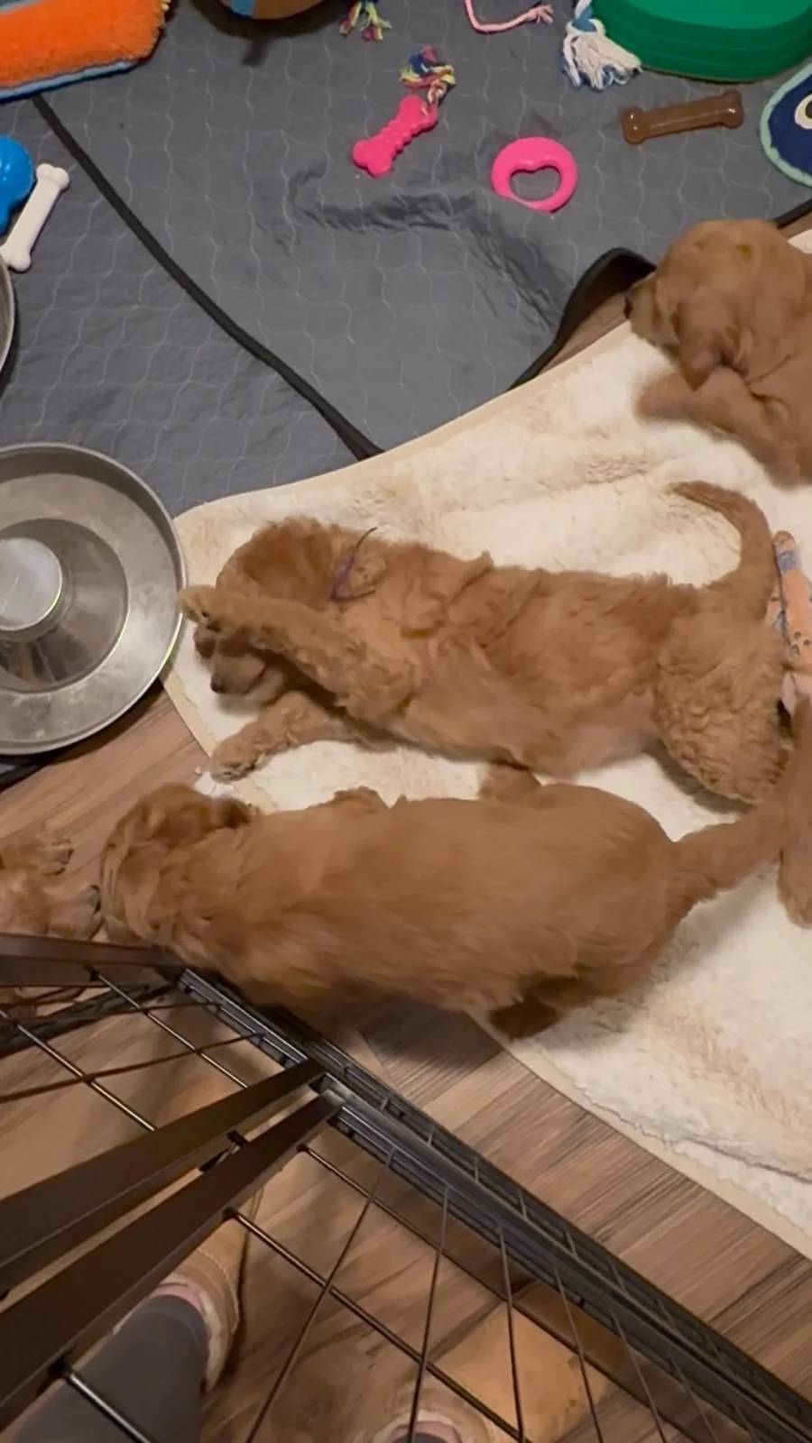 Today puppies are starting to explore their whelping bed, being a little more active and playing with each other. They are fast asleep now after a very active playtime. This weekend we are moving them out of the puppy whelping bed and will be putting them in a small puppy play area. It starts out a small area and as they get a little bigger we increase the area