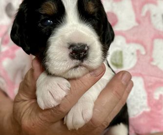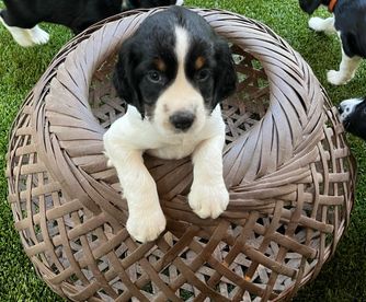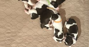 Our puppies include black white and tan, black and white, and liver and white. Colors will vary depending on the parent dogs.