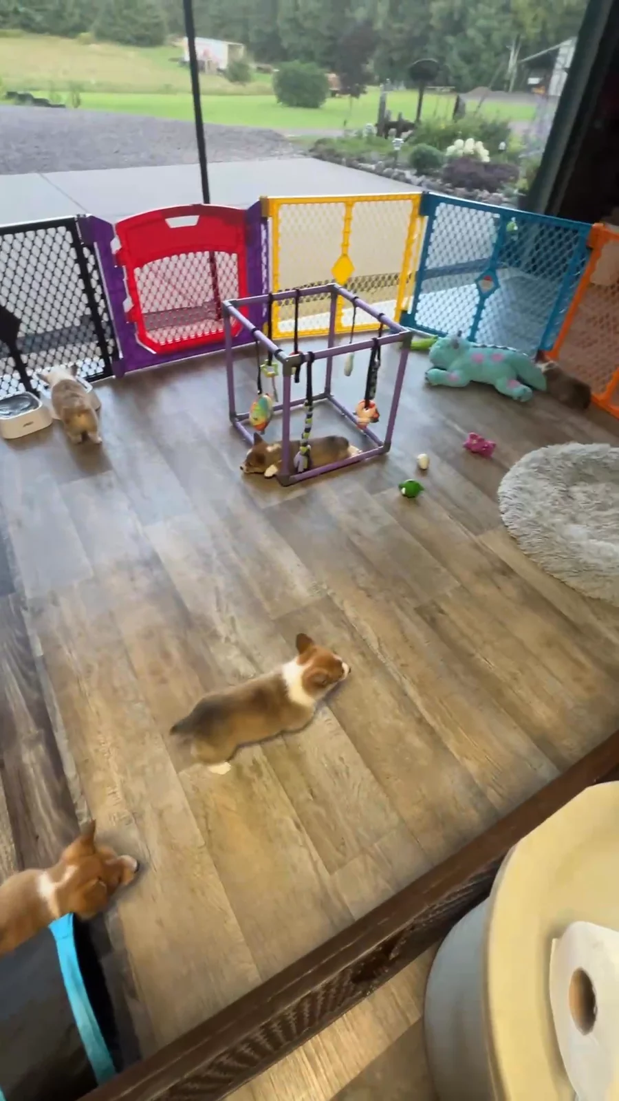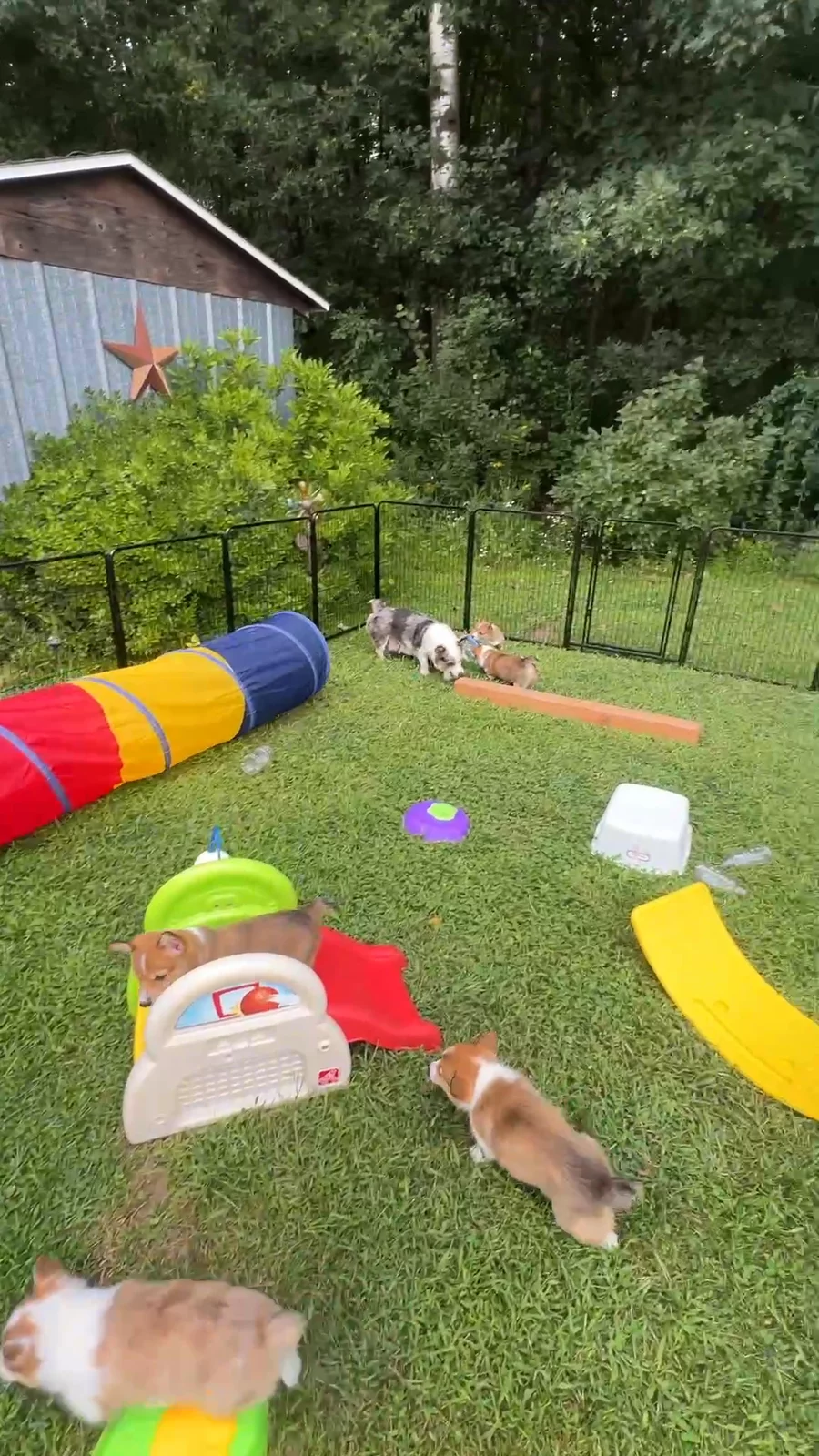 The corgi crew had a busy day! 🐾🌅 6:45am – outside potty success☀️ 9:00am – first big play session in their new outdoor pen🌙 Evening – after-dinner zoomies in the garage playpen! And everything else in between 🤪🐾