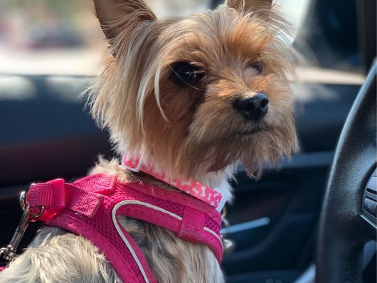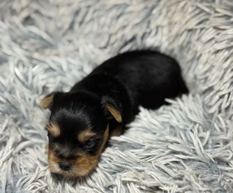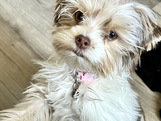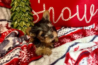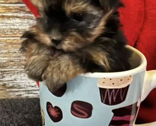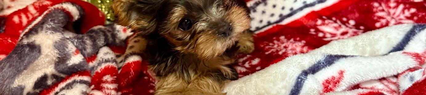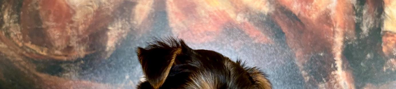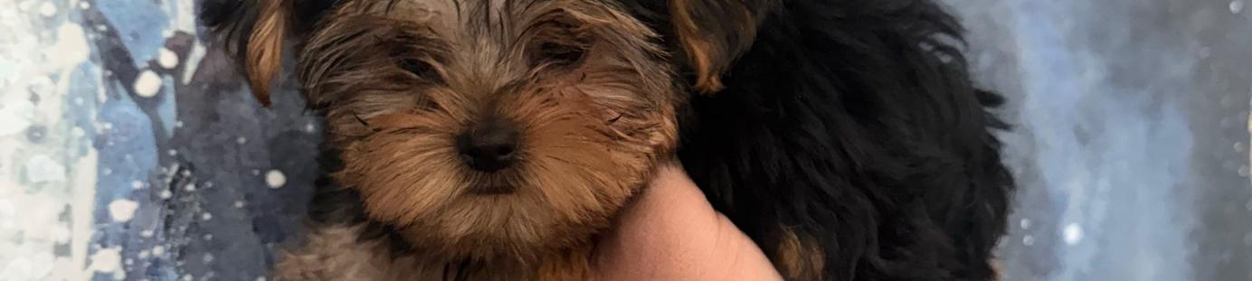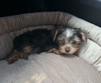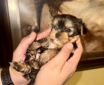 Fifi is a ray of sunshine weighing around 4lbs. She has a very mellow yet spunky personality and is very calm tempered. Fifi loves lounging around and getting her daily dose of cuddles. Fifi is a Chocolate Parti Yorkshire Terrier that is AKC registered.
