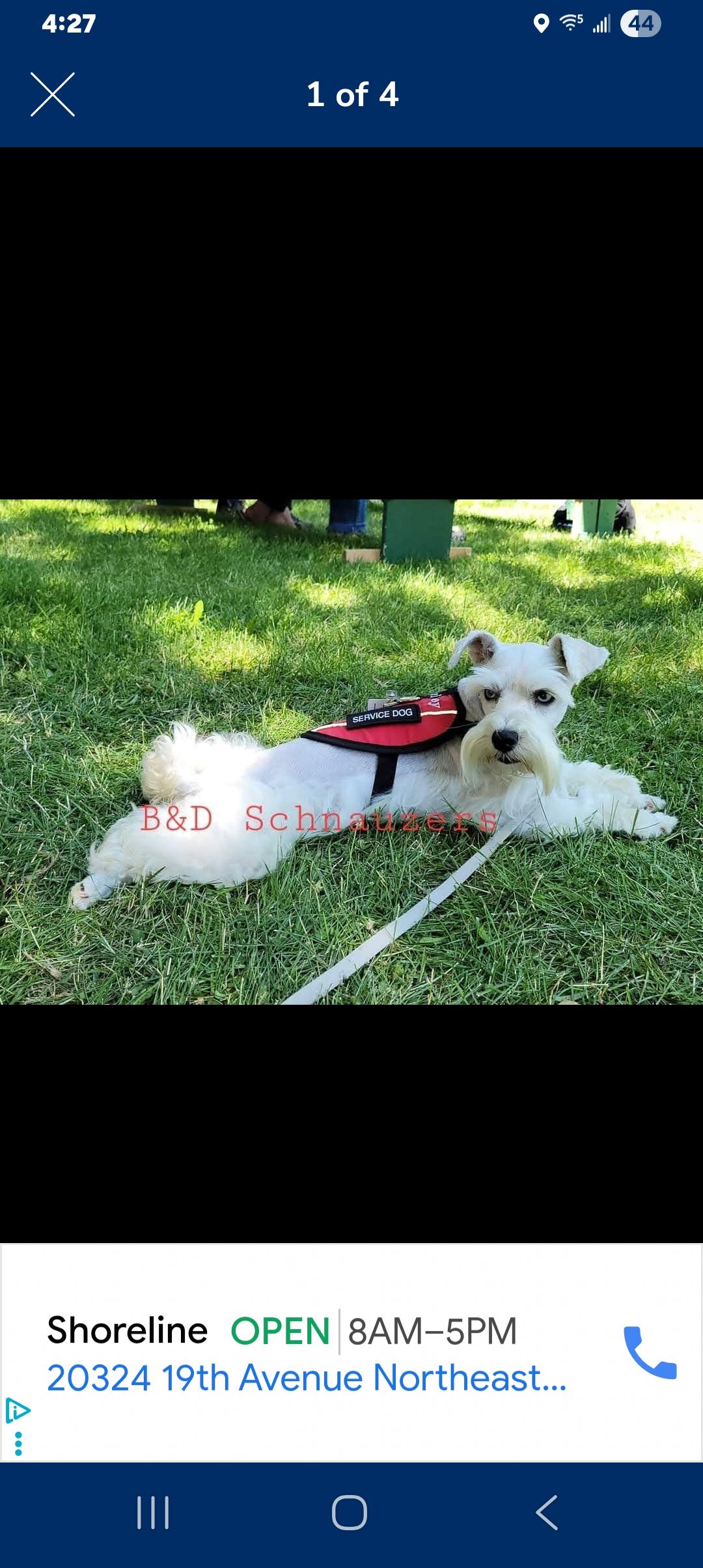 Shilo is a female Miniature Schnauzer. Carefully selected as a great representative of her breed, Debra decided to make her part of their program. Debra has passed Good Dog’s screening process, which involved a review of their breeding practices, environment, and the mental and physical health of their dogs.