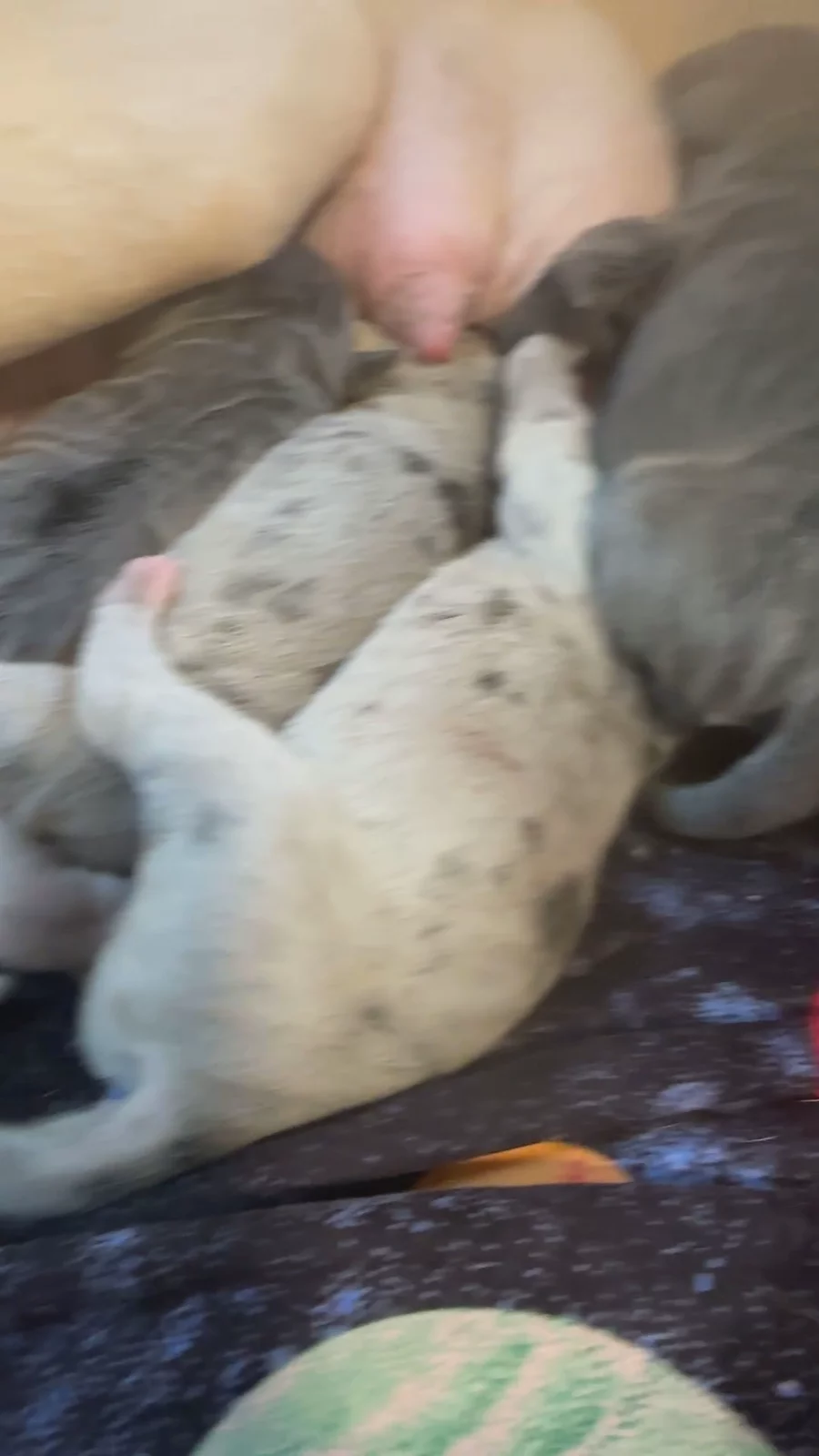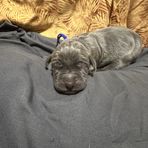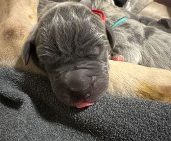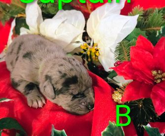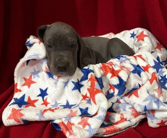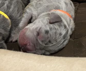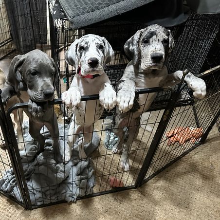 Our puppies include merlequin, blue brindle, blue and white, black and white, brindle, fawn, blue, harlequin, merle, and black. Colors will vary depending on the parent dogs.