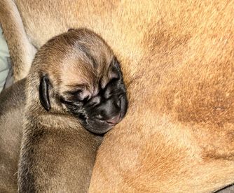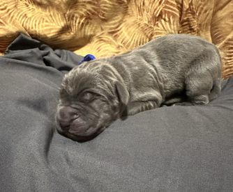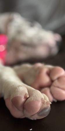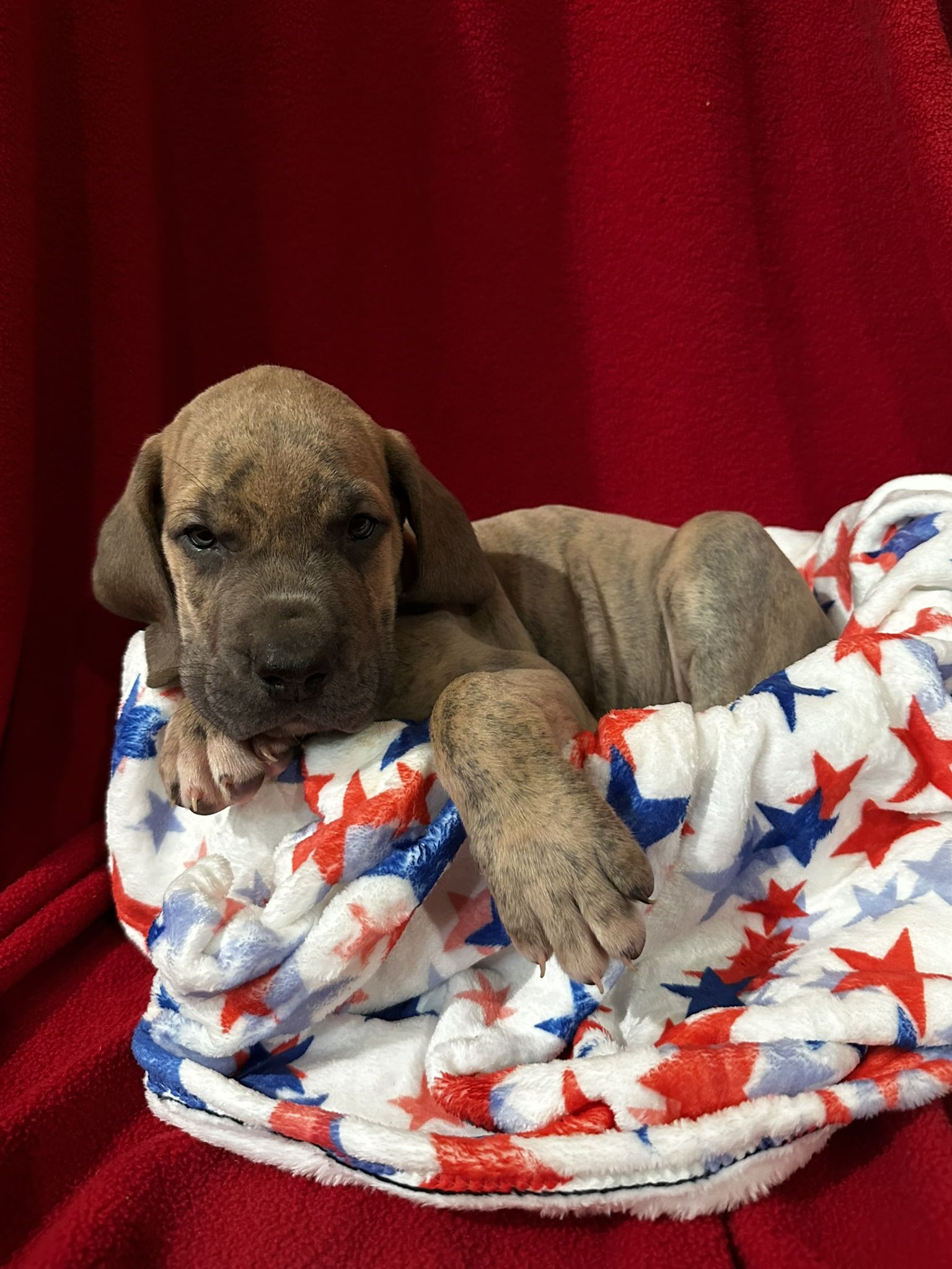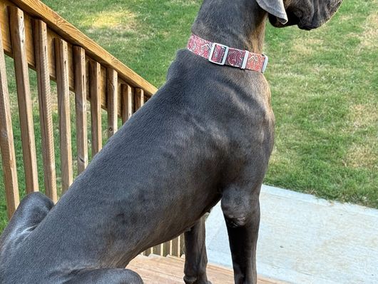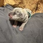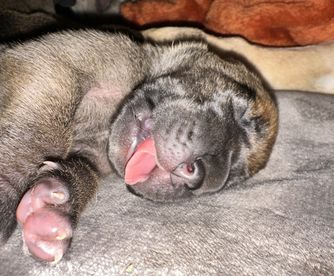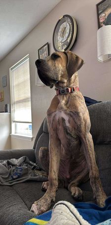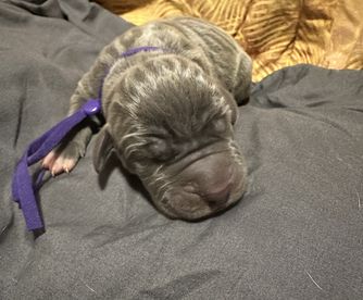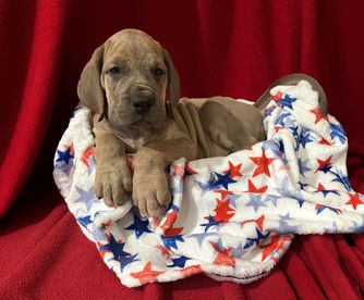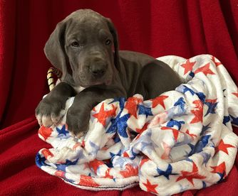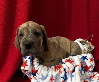 Kaiser was born 6/28/2021 from our princess Delilah and handsome Beau. He is a stock, full of love boy. He is a gentle giant who sometimes does not know his size. He LOVES his blankets over toys. He enjoys hanging out with his family getting belly rubs or leaning on us while we are cooking. He would prefer to sit or lay on you than next to you. He thinks he is a lap dog. He is AKC registered and DNA and genetic tested.