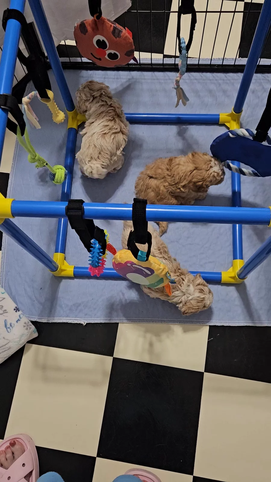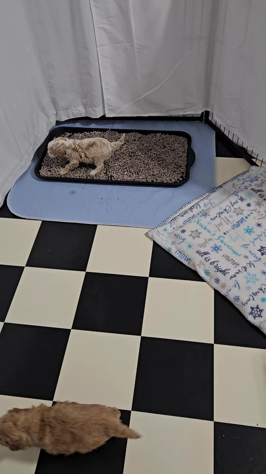 These two Goldendoodle boys are waiting for someone to break them out of jail!! 😆 They've had their 1st puppy shot, been dewormed and vet checked! They are litterbox trained for the most part!! They will be small dogs. 14lb mom and only 9lb dad!! They are ready to go NOW!!