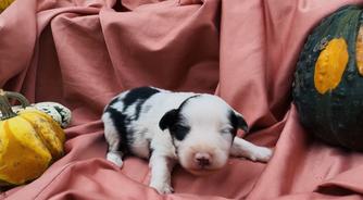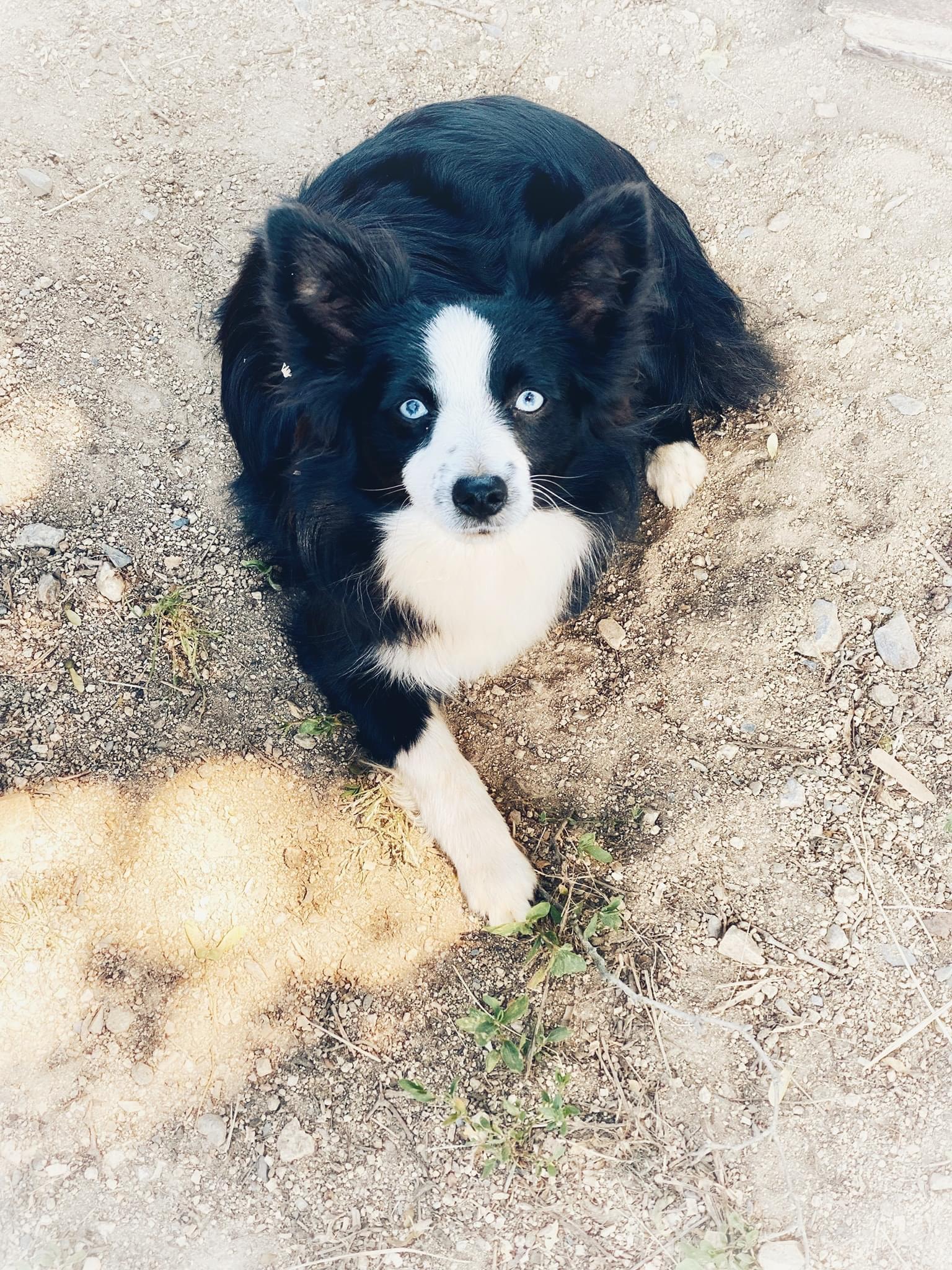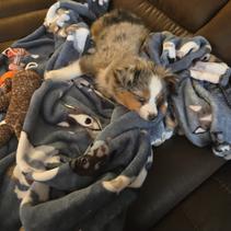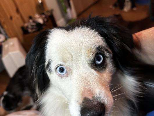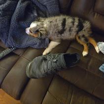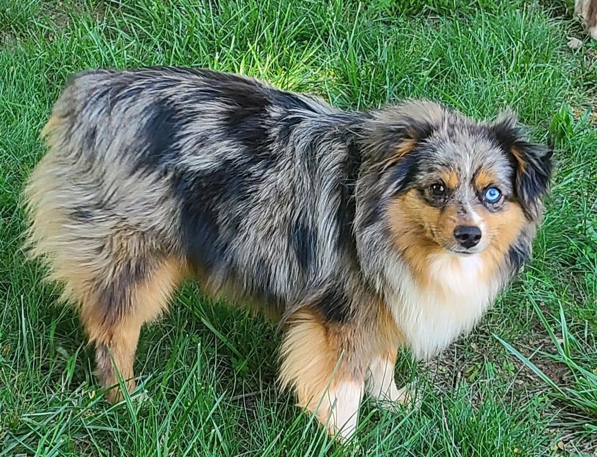 Pepper is a gorgeous blue merle tricolor with tons of drive and playfulness. She is my best frisbee dog! She has a very sweet nature and loves everyone she meets.