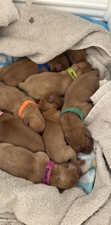 Our breeding program is special because we produce just one litter at a time and spend an ample amount of time with our puppies, socializing them with sounds and introducing them to lots of people and stimuli. We pour our hearts and souls into their health and development and strive to deliver the best puppies we can. We are proud of what we do!
