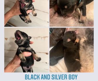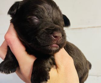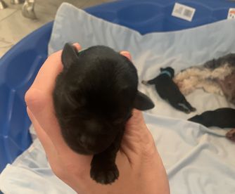 Precious little AKC/CKC dual registered solid black, megacoated boy with bright blue eyes. He is a little lover that is happy sitting in a lap and snuggling! Embark health test clear!
