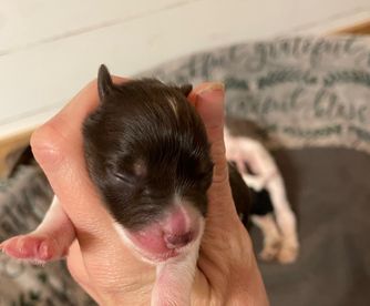 Scarlett is a CKC liver Parti, heavily ticked. She has the sweetest personality you will ever meet! Scarlett doesn’t have a mean bone in her body. She is so happy that she wags her whole body when she wags her tail and she loves to cuddle and give kisses. She loves to go anywhere her family goes 😍 She has a megacoat and it is so soft 😊