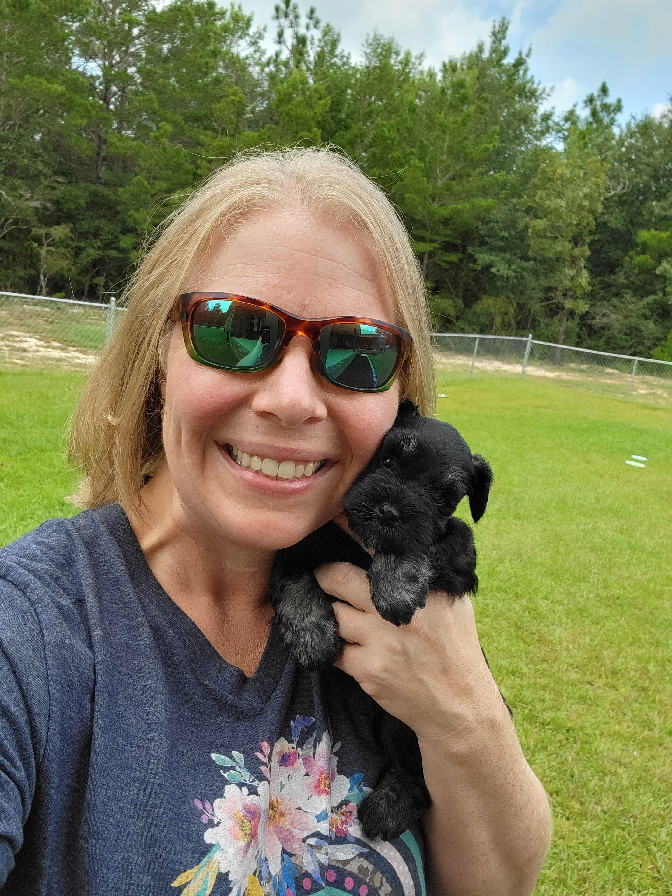 I'm Trisha D., the breeder behind Dees Schnauzers located in Crestview, FL. We have had a very small home breeding program for 20 years. We strive to produce the best puppy for your family. We start crate training and potty training at 5 weeks old. The puppies will go home with their first crate and puppy package. I groom all puppies. We socialize all puppies with adults, children of various ages as well as other dogs. They learn to use a doggy door. Vet provides all shots.