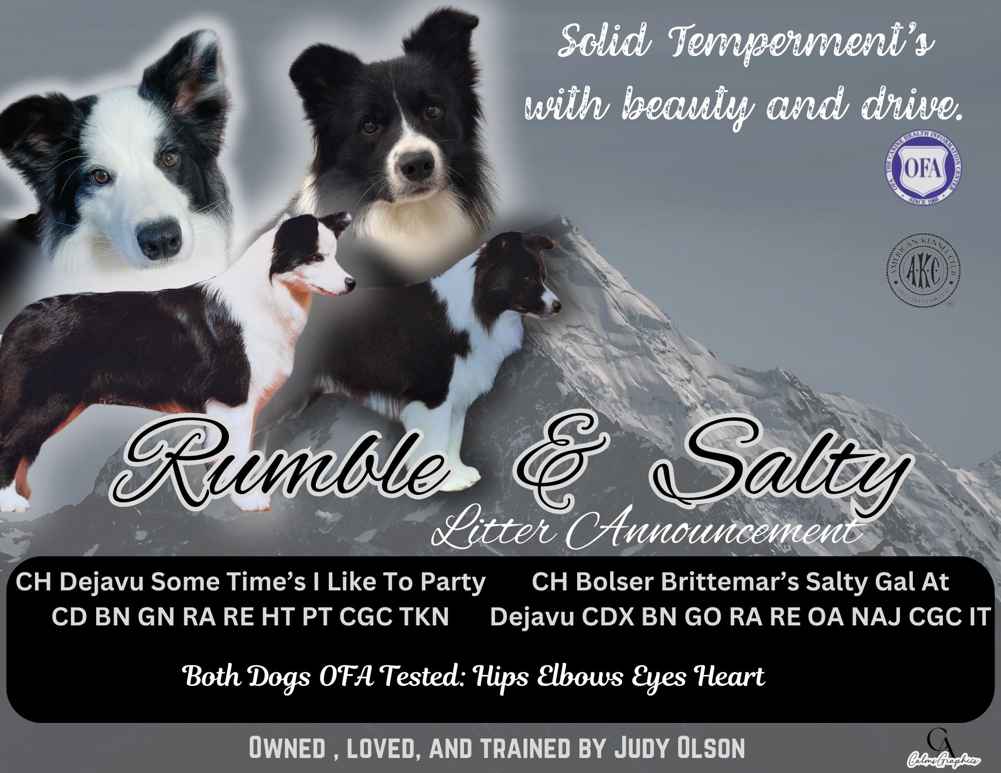 Rumble has great temperament and is excelling in all of the events he has been entered in. He is currently in training for agility and started sheep and ducks. He has nice bone and was 3rd out of 23 border collies for head type at the Border Collie National in 2024.