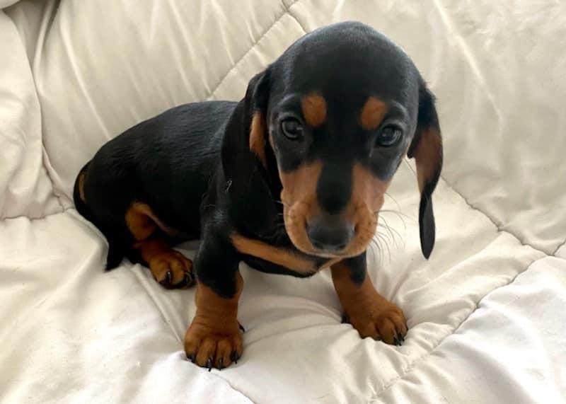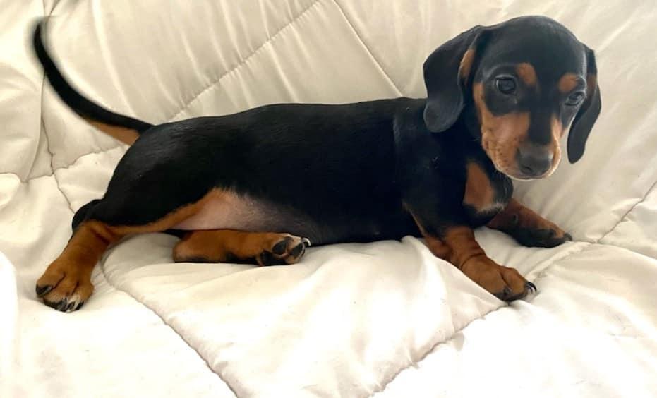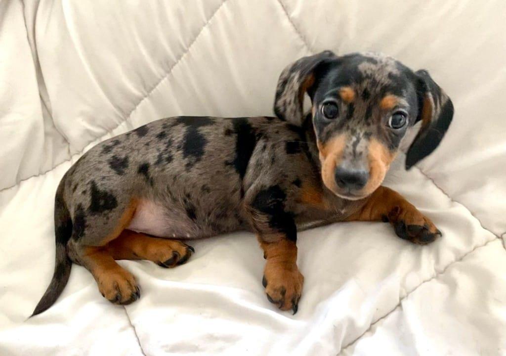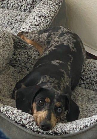 Jelly Bean is our CKC registered smooth black & tan dapple that carries chocolate, dilute, brindle & piebald and is health tested clear. She is such a playful girl and we love her dearly.