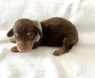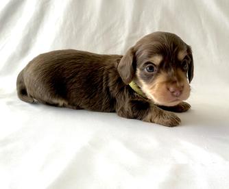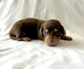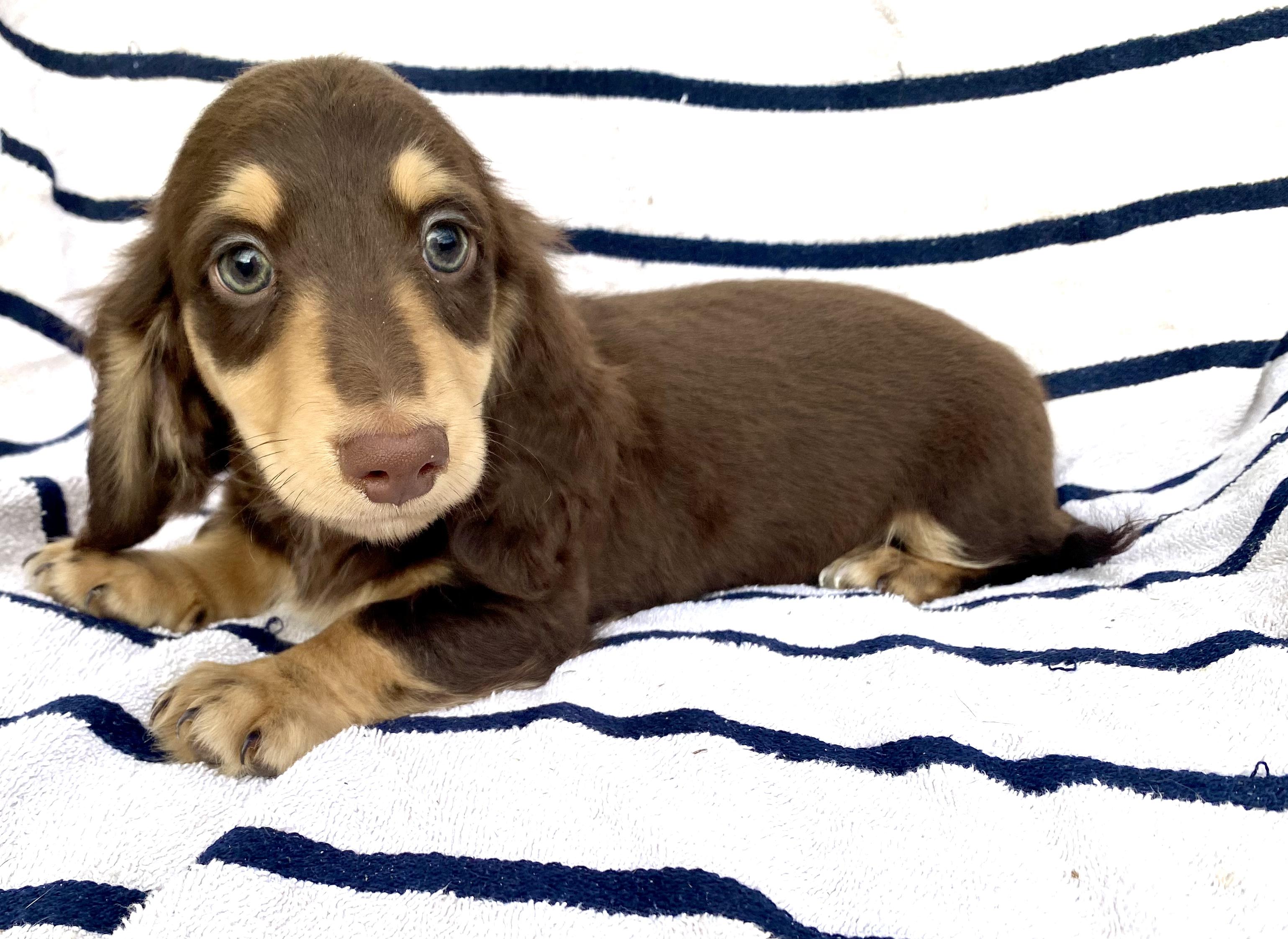 Brody is our AKC-registered longhair chocolate & cream, carrying, and is health-dilute & piebald tested clear. He is a very fun, playful doxy, and he has fit in with our pack wonderfully.