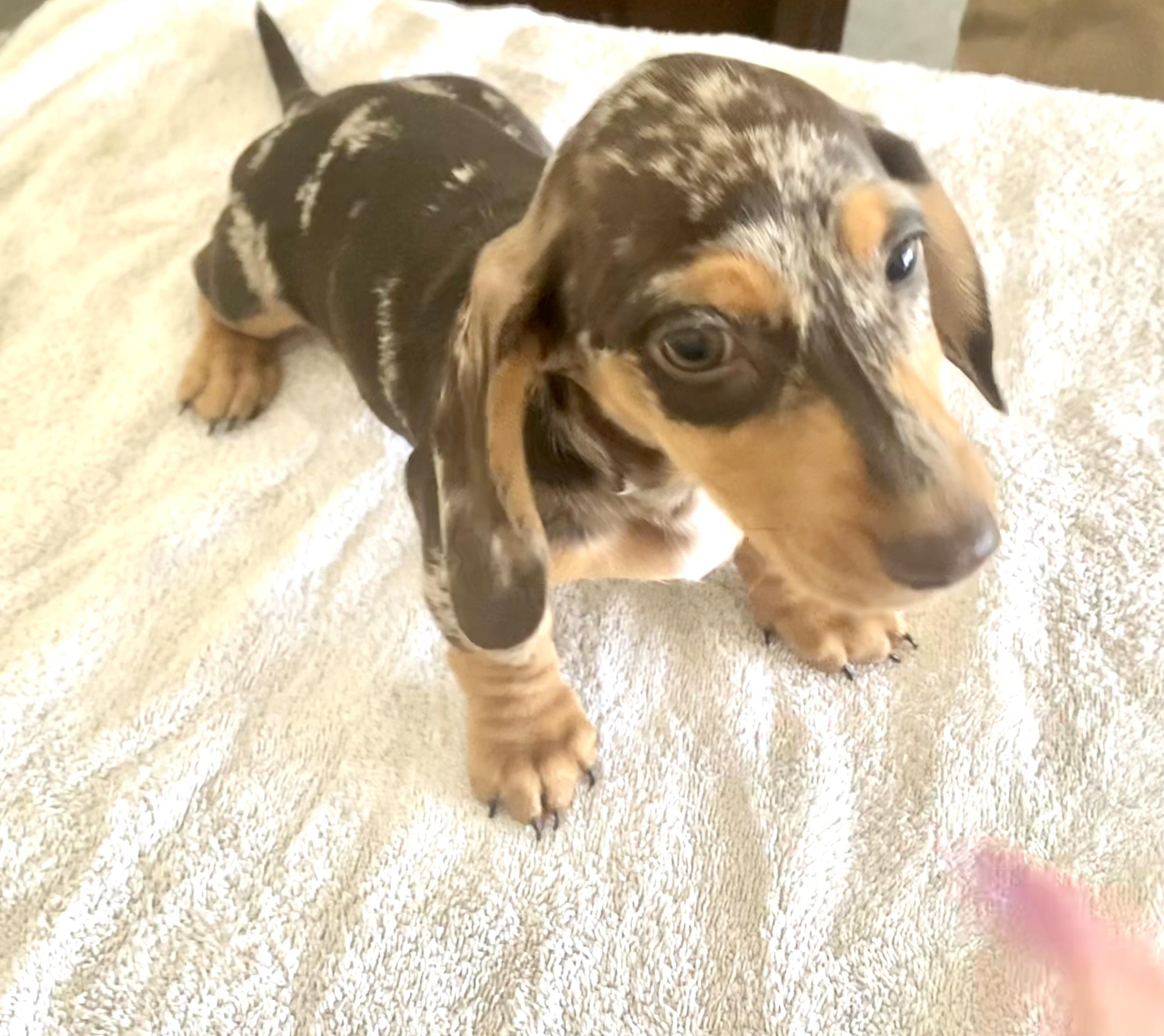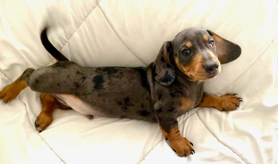 Nova is our CKC-registered smooth short hair black & tan dapple that carries chocolate & piebald and is health-tested clear. She is a very sweet and playful doxy, and she fits in with our pack wonderfully.