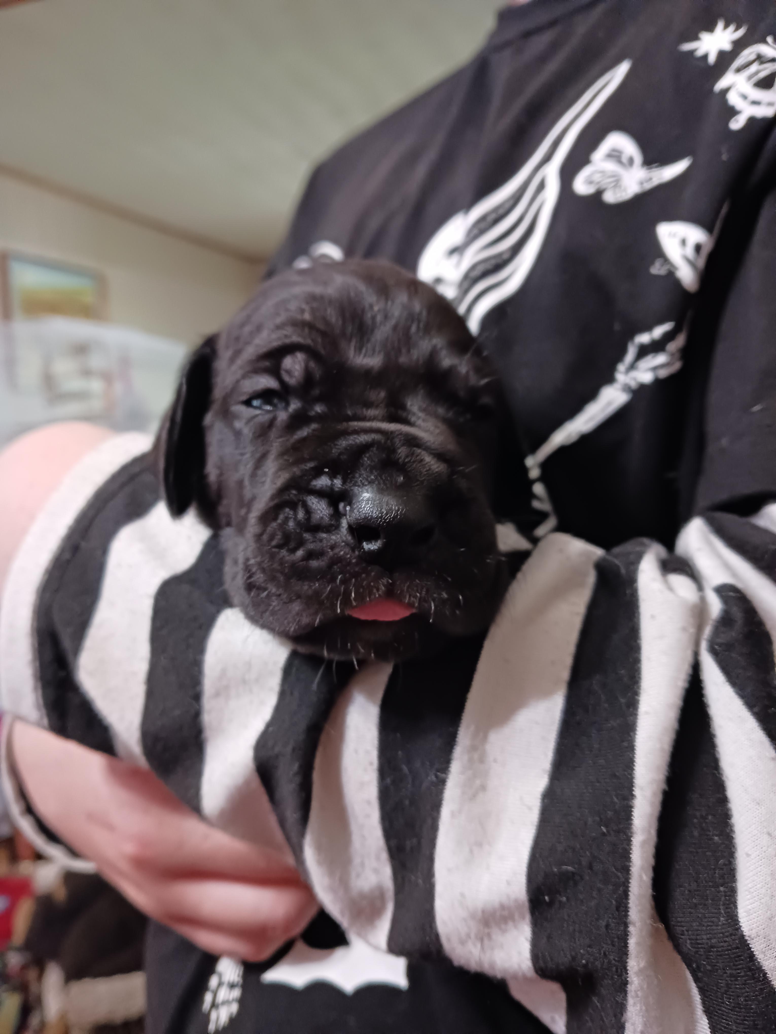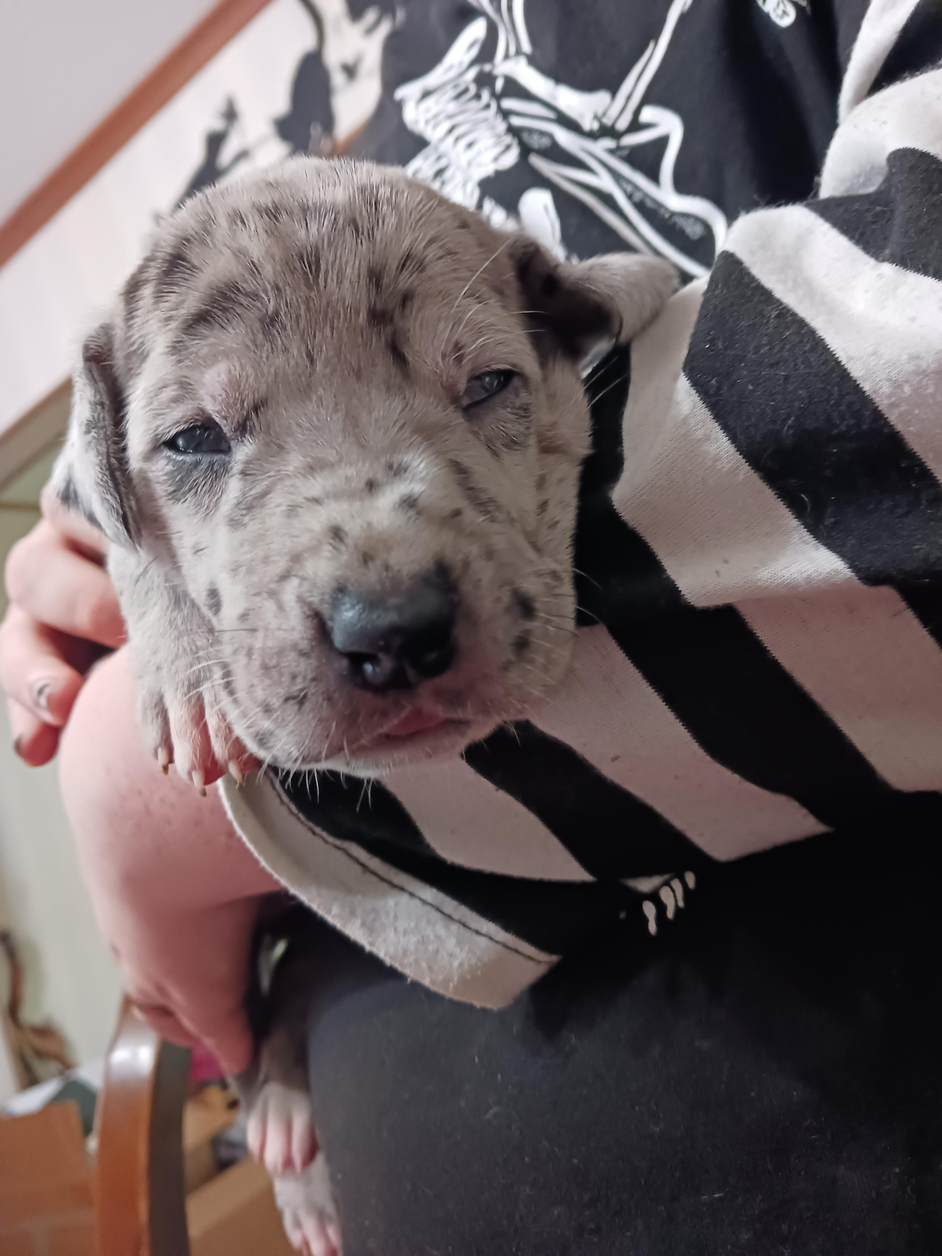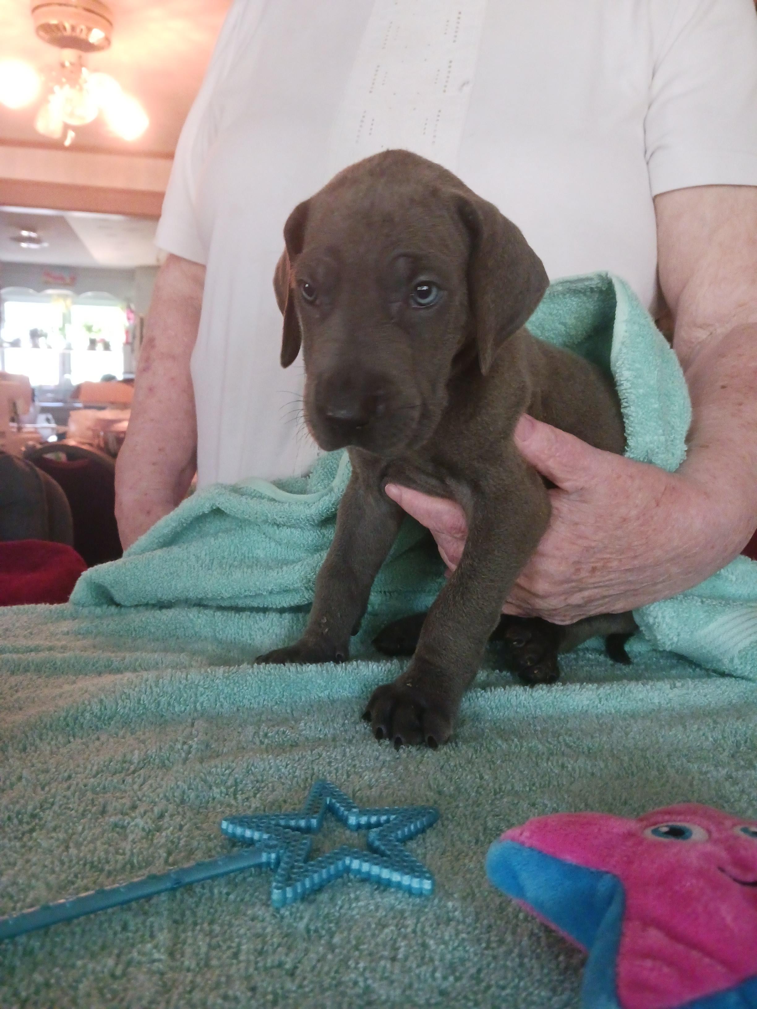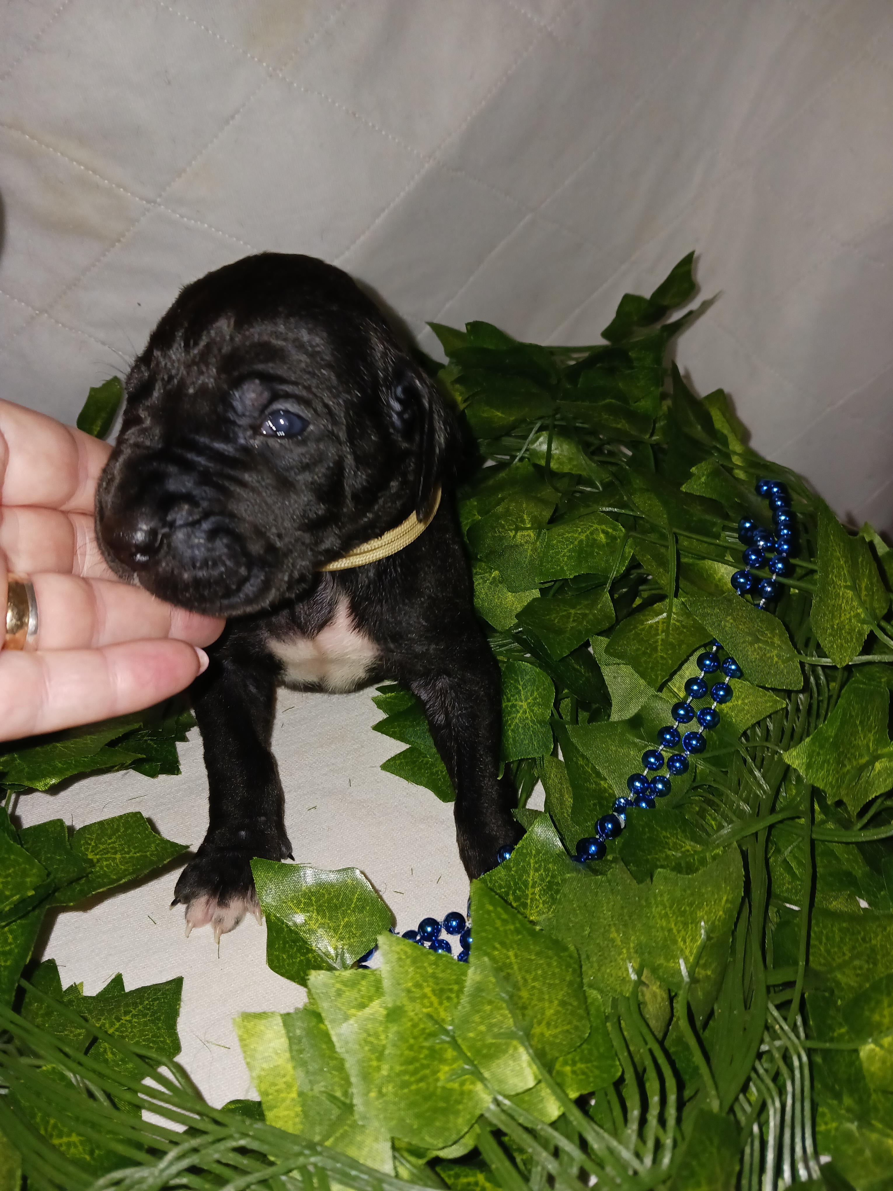 I'm Genile D., the breeder behind Dennison's Danes located in Springfield, MO. My program is built upon a foundation of love, admiration, and respect for the Great Dane breed. My focus is on maintaining their breed standards by raising structurally sound and correct puppies with excellent temperaments. I show all my mommas and daddy's. I do not breed until they are DNA health tested clear, and have at least one Championship. I show in multiple registries including AKC, UKC, ACA, and APRI. It is so fulfilling to have the opportunity to create companionship and love and to see the positive effect that a beloved, furry companion can have on its family! Our puppies are raised in our home, never in a kennel. Our mommas live in the house, sleep with my husband and I. When they whelp I sleep with them, next to the whelping box.
