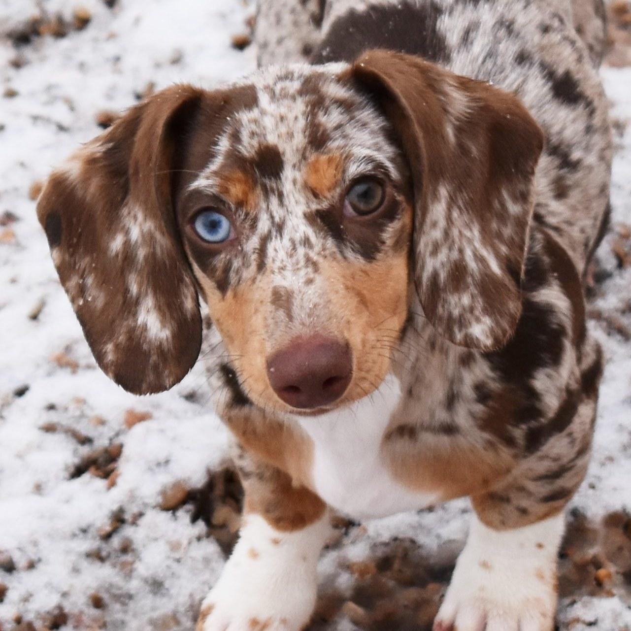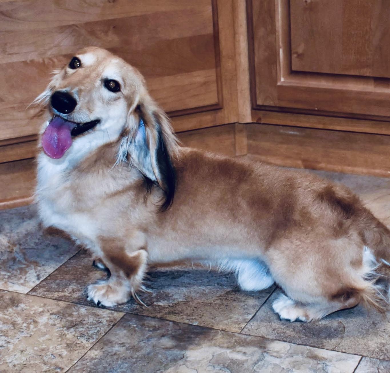 Miss Daizie Mae is a second generation Desert Horizon Dachshund. She is a shaded red brindle, her coloring is stunning in the sunlight.