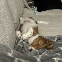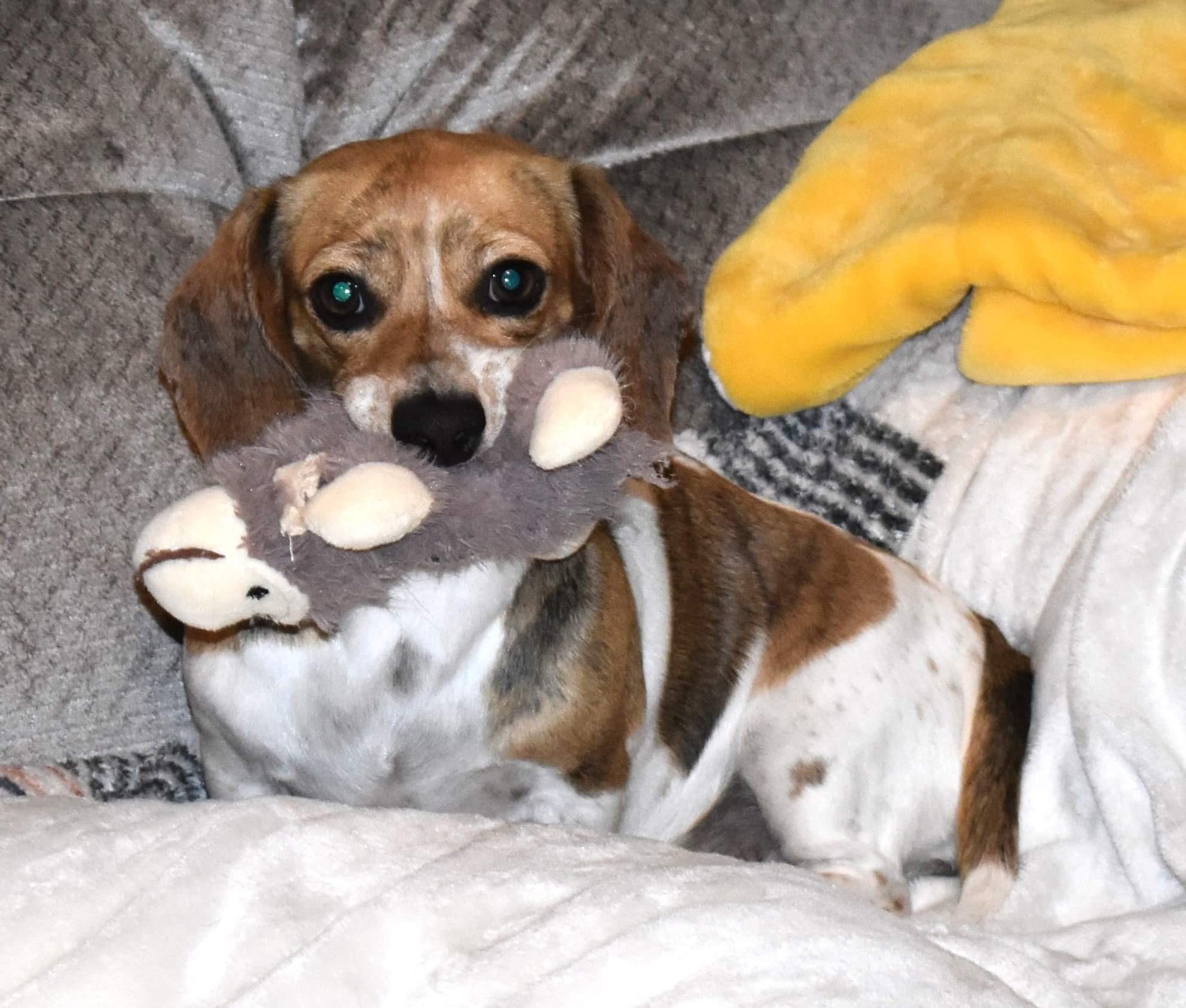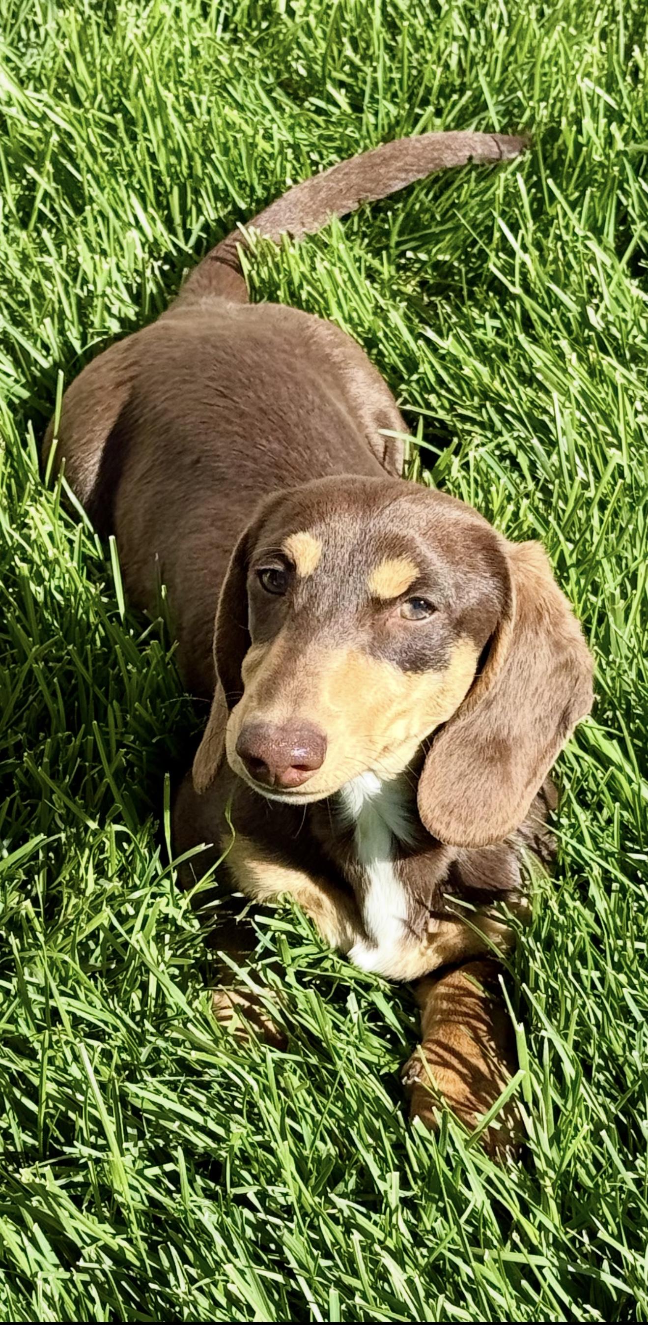 She is a love bug who prefers to lay on your lap or wrestle with the other dachshunds outdoors.