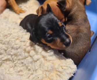 Miniature Pinscher puppies include black and rust and stag red. Colors will vary depending on the parent dogs.
