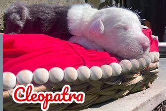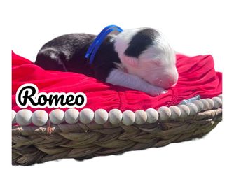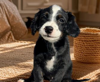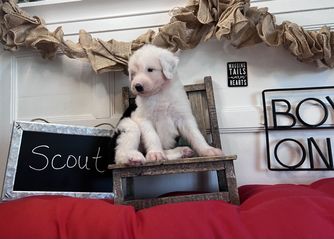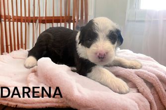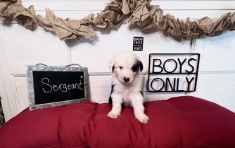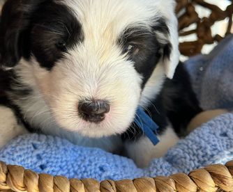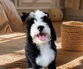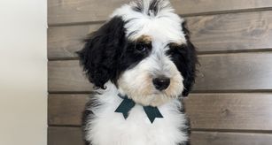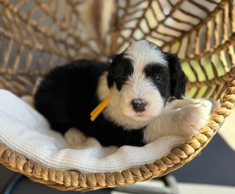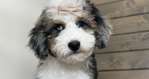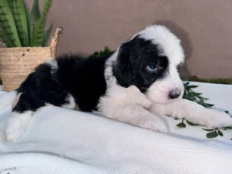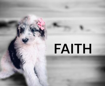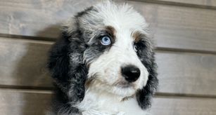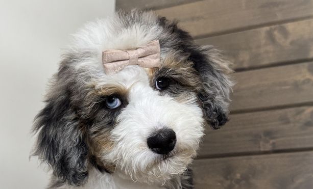 Our Bernedoodle puppies include tri-color and merle. Old English Sheepdog puppies are gray and white. Sheepadoodle puppies include blue merle and white, blue merle, and black and white. Colors will vary depending on the parent dogs.