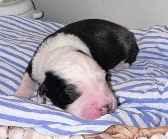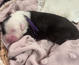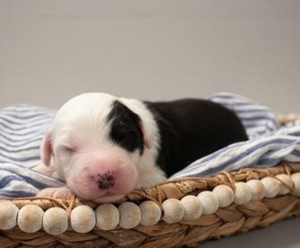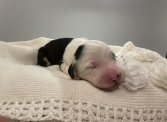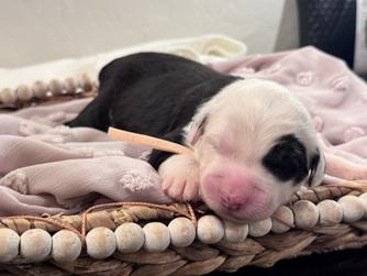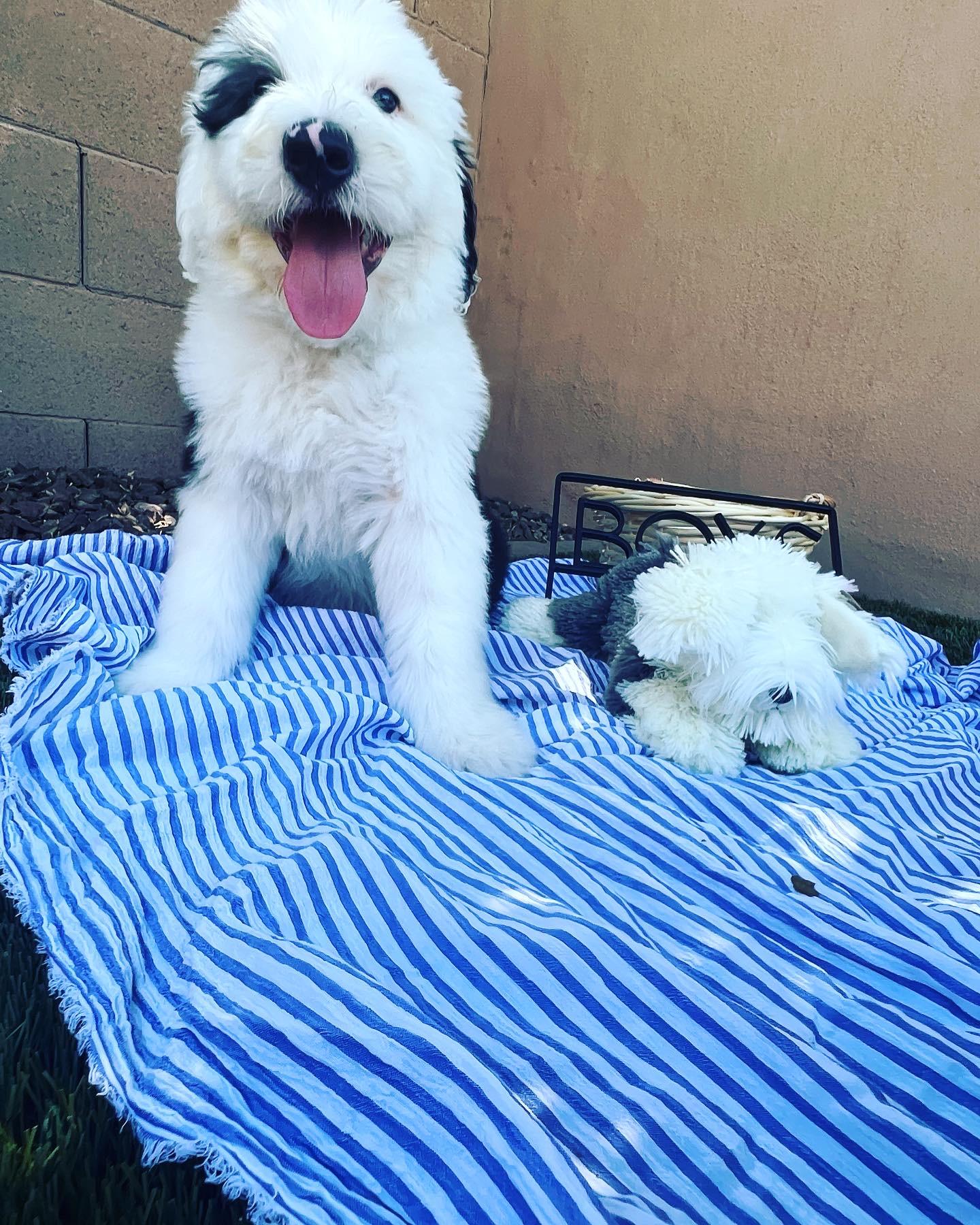 Our Sheepadoodle puppies include blue merle and white, blue merle, and black and white. Old English Sheepdog puppies are gray and white. Bernedoodle puppies include tri-color and merle. Colors will vary depending on the parent dogs.