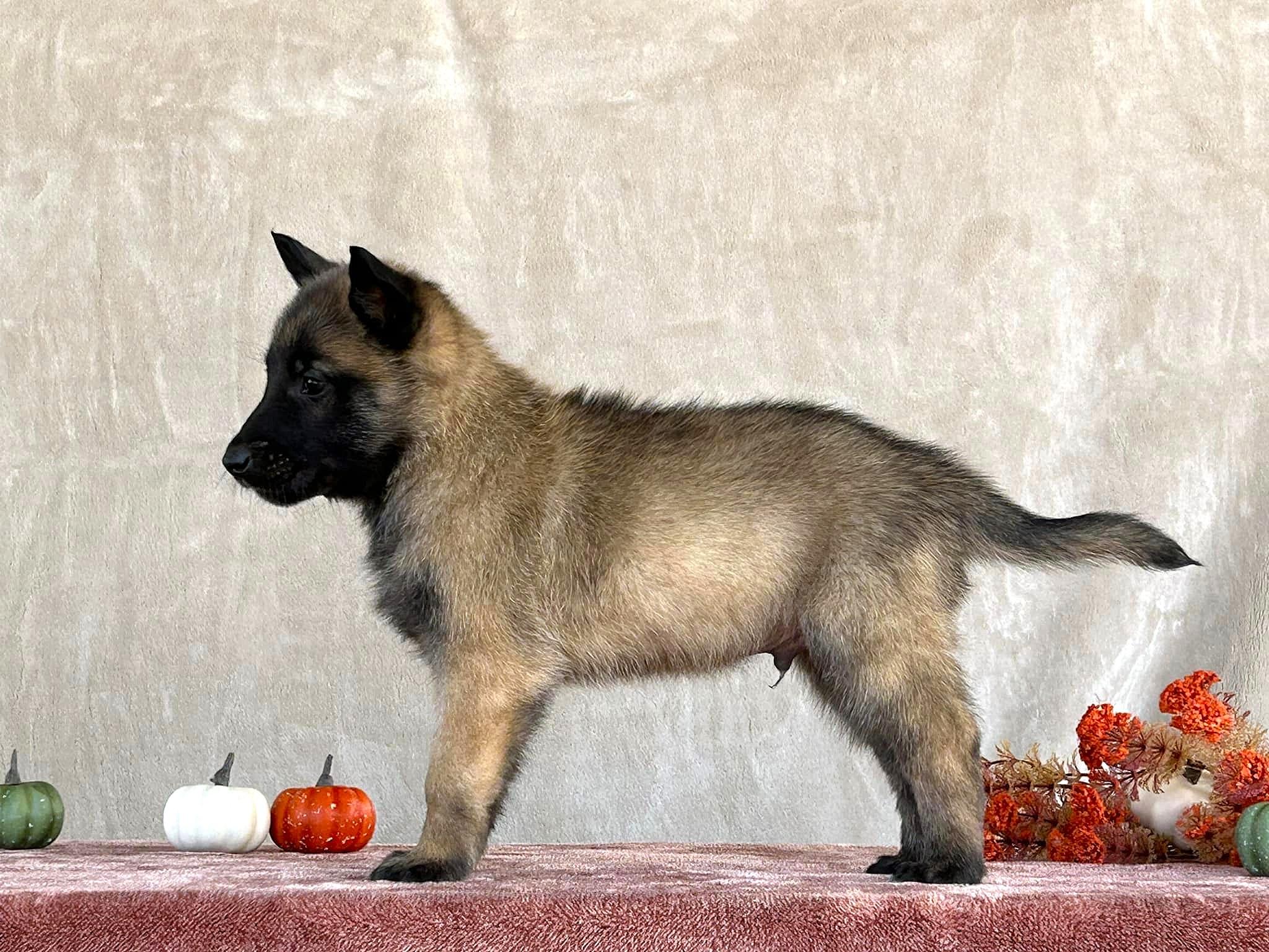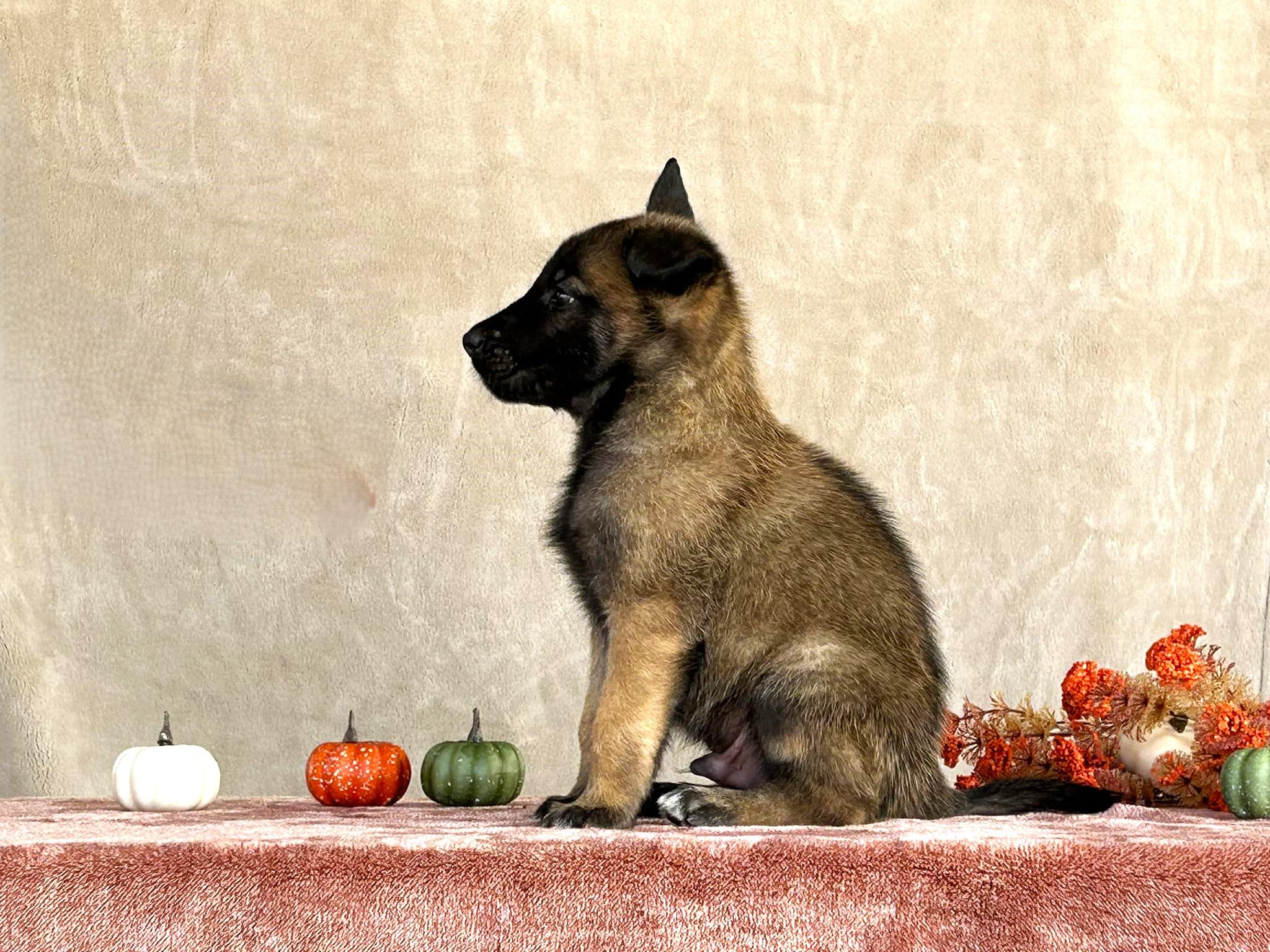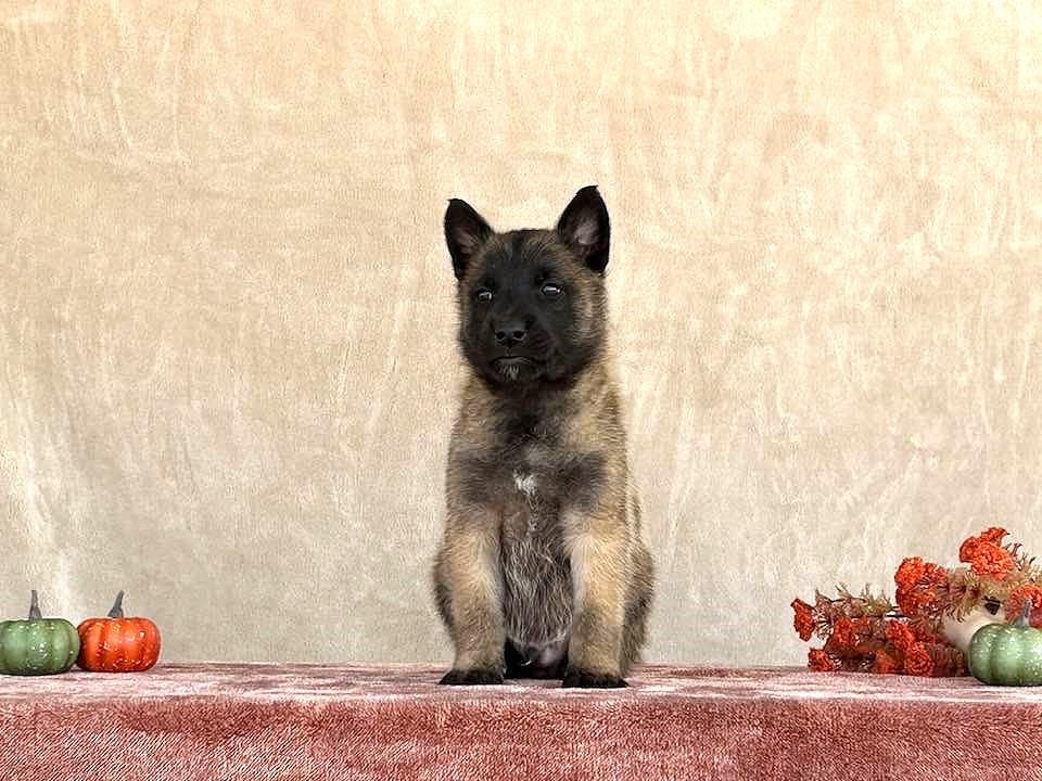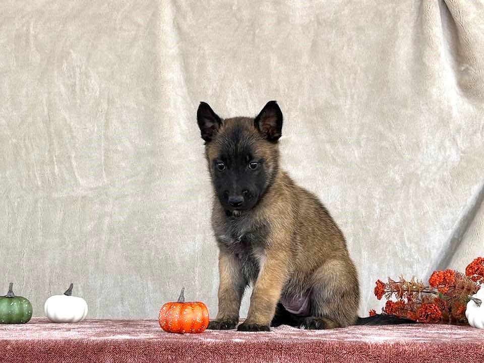 Our Belgian Malinois puppies include mahogany and fawn. Australian Shepherd puppies include blue merle and black tri-color. Colors will vary depending on the parent dogs.