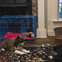 We start ENS at 3 days old, remove dewclaws, file & trim nails early on and slightly groom early on to get them used to that process. We start crate training and potty training to set them up for success as well. Our dogs will go home up to date on shots, dewormed at 2,4,6,8+ weeks depending on how long they stay in our home.