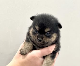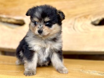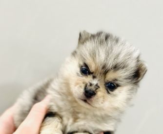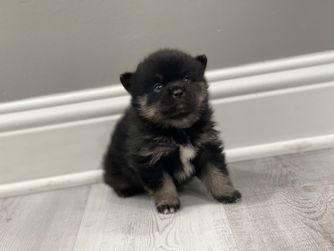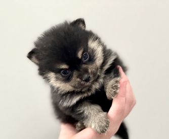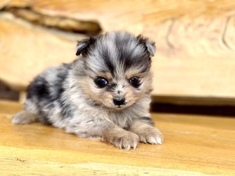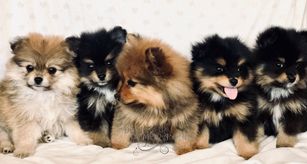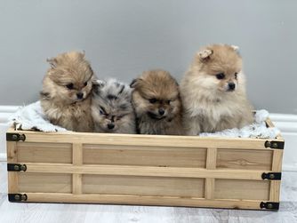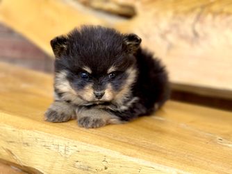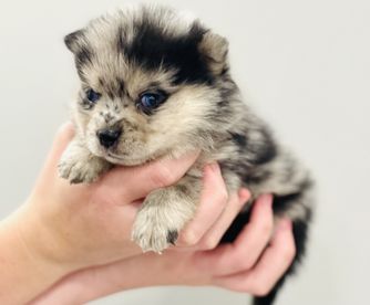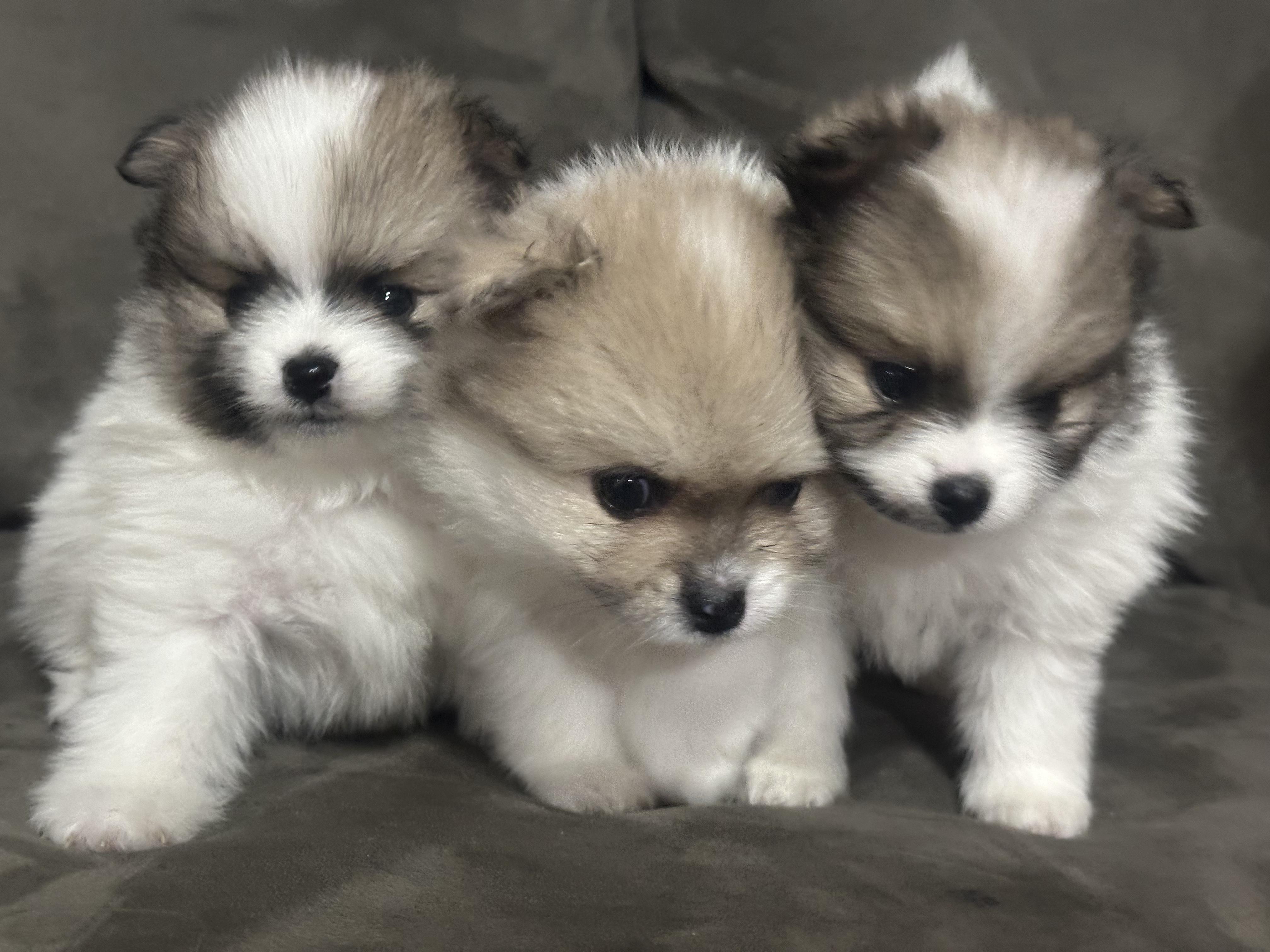 Our Pomsky puppies include black, chocolate, merle, and red and white. Pomeranian puppies include red, orange, cream, black, and blue. Colors will vary depending on the parent dogs.