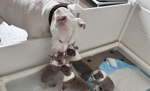 Our puppies include seal brindle and white and seal and white. Colors will vary depending on the parent dogs.
