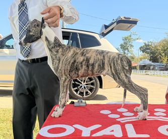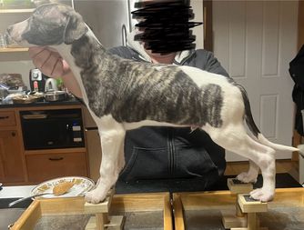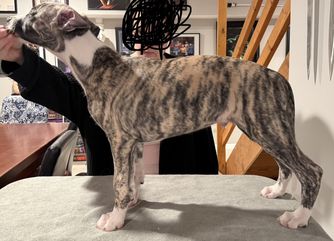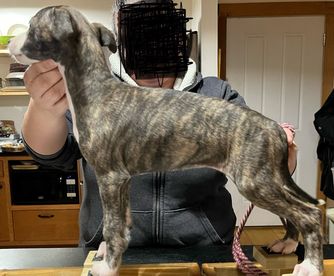 Our puppies include black brindle, white and fawn brindle, white and fawn, white and black, fawn brindle, and black. Colors will vary depending on the parent dogs.