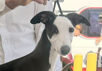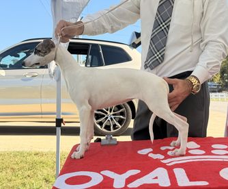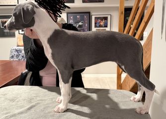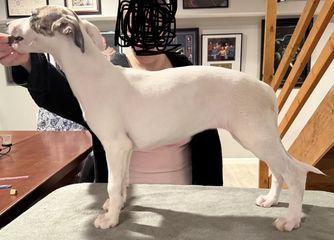 Wiggles is a male Whippet. Carefully selected as a great representative of his breed, Heather & Chris decided to make him part of their program. Heather & Chris has passed Good Dog’s screening process, which involved a review of their breeding practices, environment, and the mental and physical health of their dogs.