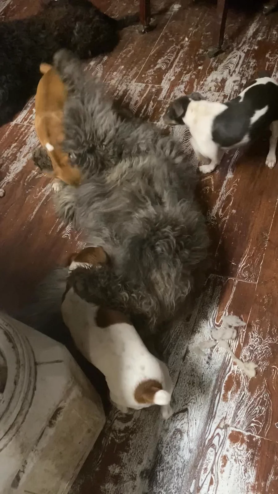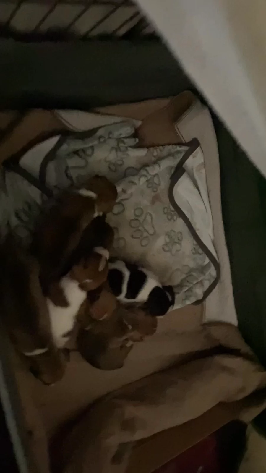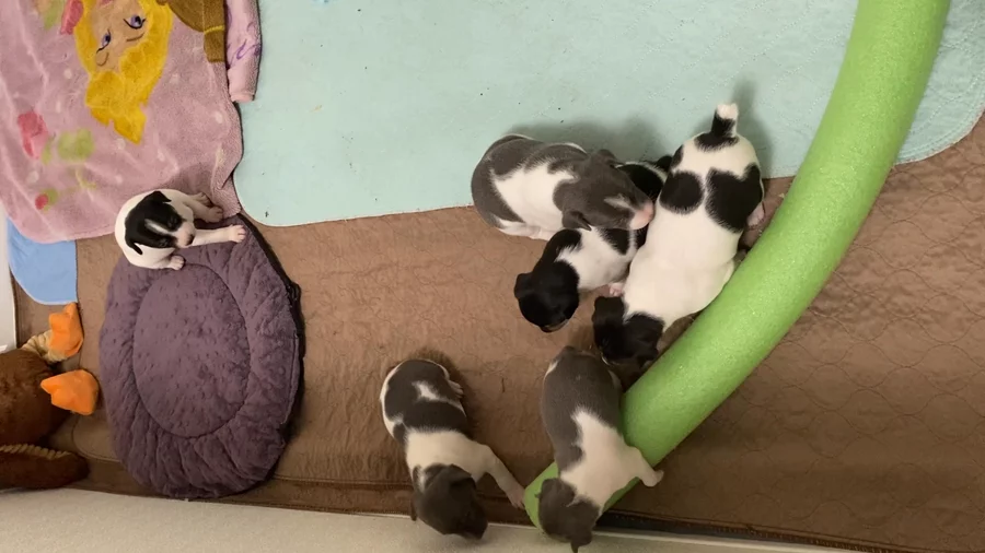 Pups are all doing great! Frankie- our oldest available pup- is currently with our cobreeder for more social interactions and basic training. He is going to make some lucky person a great BFF! The younger pups are learning more every day. Currently they are all sleeping overnight in their individual crates, then going out the dog door to potty. Regular individual time is going well. They are smart, social pups! 🐶